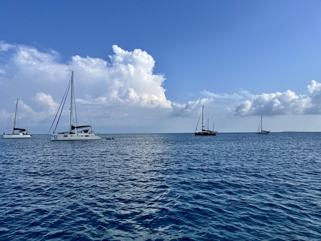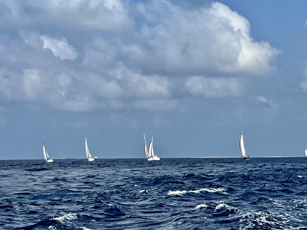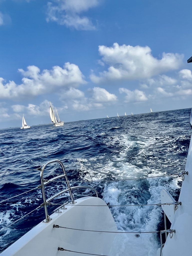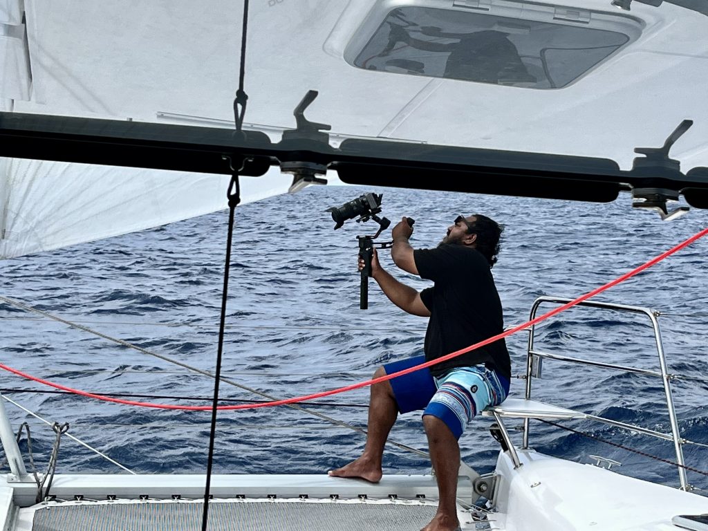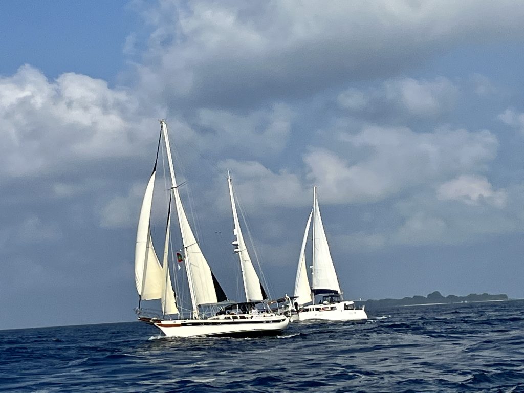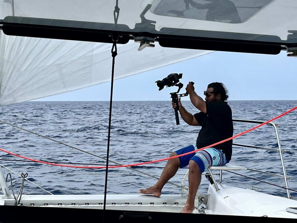 Was Addy filmt wird für Promotion der Malediven verwendet. Wir hoffen auch etwas davon zu Gesicht zu bekommen. Aber jetzt heißt es Segel setzen, wir machen das ja hier nicht zum Spaß! Wir wollen die Etappe wieder gewinnen 🏆. Nein, so ernst wird das alles nicht genommen. Wobei unterschwellig, bei den Männern, doch so etwas wie Wettkampfgeist besteht. Also gut. Groß wieder voll raus, Screecher dazu und ab geht die Post. Stopp! Erst muss noch eine Formation gebildet werden, für die Medien, Kameras, Fotoapparate und Drohnen. Dieses Mal klappt es besser. Sie haben die Bilder, die sie brauchen im Kasten. Danach dauert es nicht lange, und wir düsen wieder an die Spitze. 😜