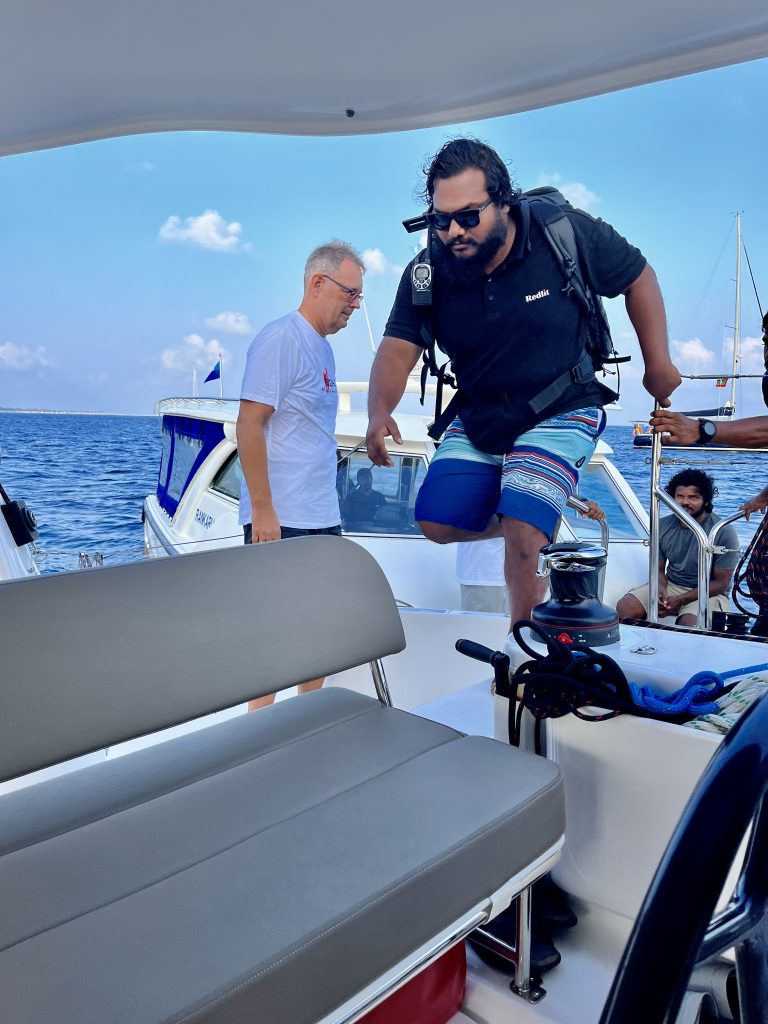 Heute geht’s weiter nach Dhangethi, gelegen im Alif Dhaal Atoll. Da kommt auch schon Adam, der Kameramann. Er wird uns heute den ganzen Tag an Bord begleiten und filmen. Das kann ja heiter werden…