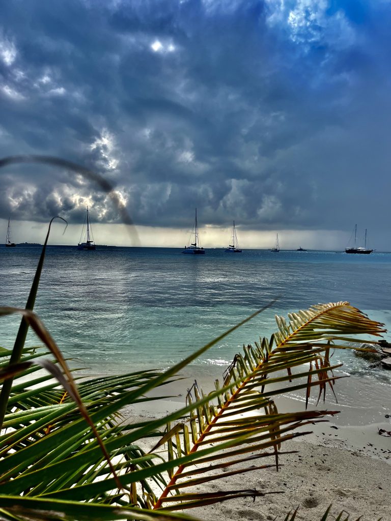 Wir bauen den Vorsprung auf sage und schreibe fünf Seemeilen aus und segeln als erste in das Alif Dhaal Atoll hinein, Richtung Ankerplatz. Die Fahrt zum Ankerplatz hat’s aber in sich. Es gibt nur einen schmalen Eingang zur Insel und der Weg ist mit Korallenköpfen gepflastert. Ohne Google Maps völlig unmöglich. Oder ohne the lovely Ibrahim! Er führt uns sicher durch das Steinlabyrinth bis zum Ankerplatz. Herrlich! Wir brauchen nur genau hinterher fahren. Seeehr angenehm! Und dann liegen wir vor Dhangethi, in einer ruhigen Bucht und machen Wasser. Brumm, brumm ….