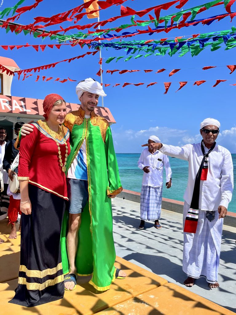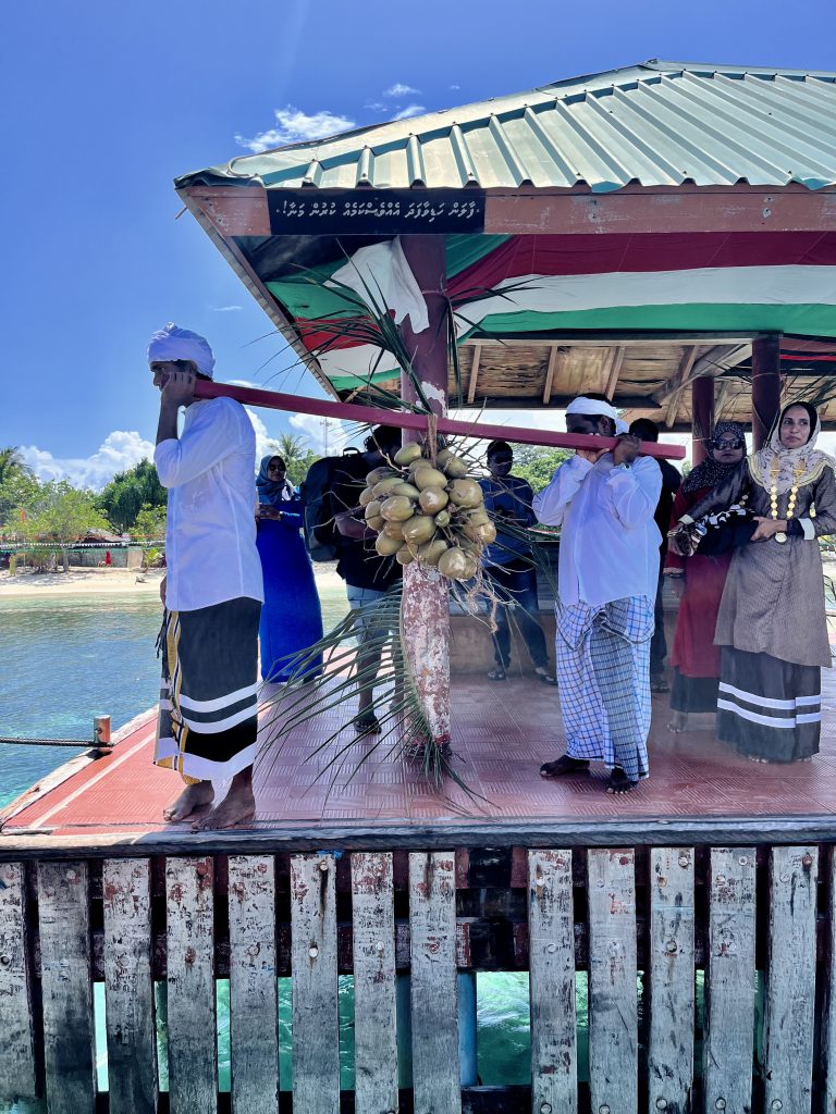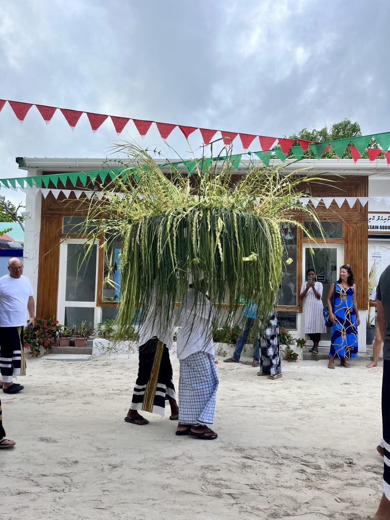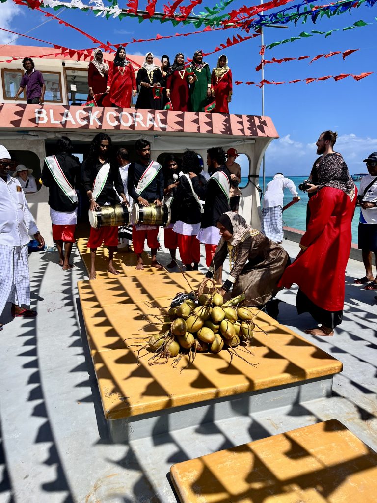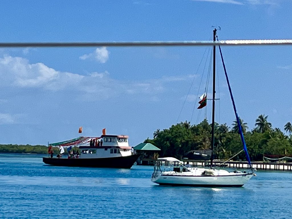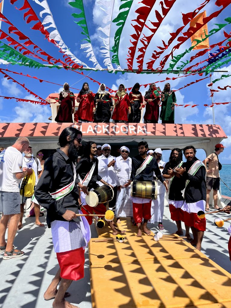 Heute werden wir auf Dhangethi empfangen. Doch diesmal läuft die Zeremonie ganz anders ab. Ein großes, altes Fischerboot ist wunderschön geschmückt und mit Tänzern, Trommlern und Sängern besetzt. Es fährt zwischen unseren Booten umher, Gesänge und Trommelklänge wehen zu uns rüber. Sehr schön anzusehen und zu hören.