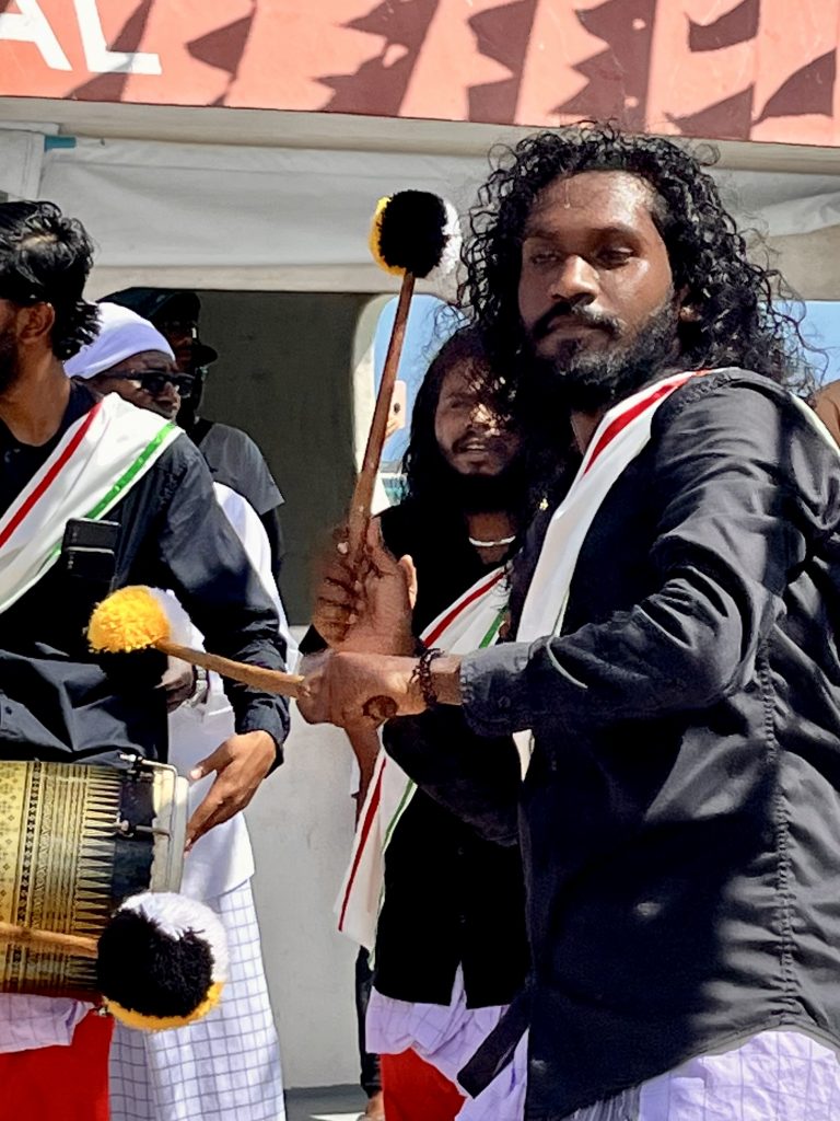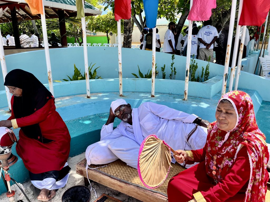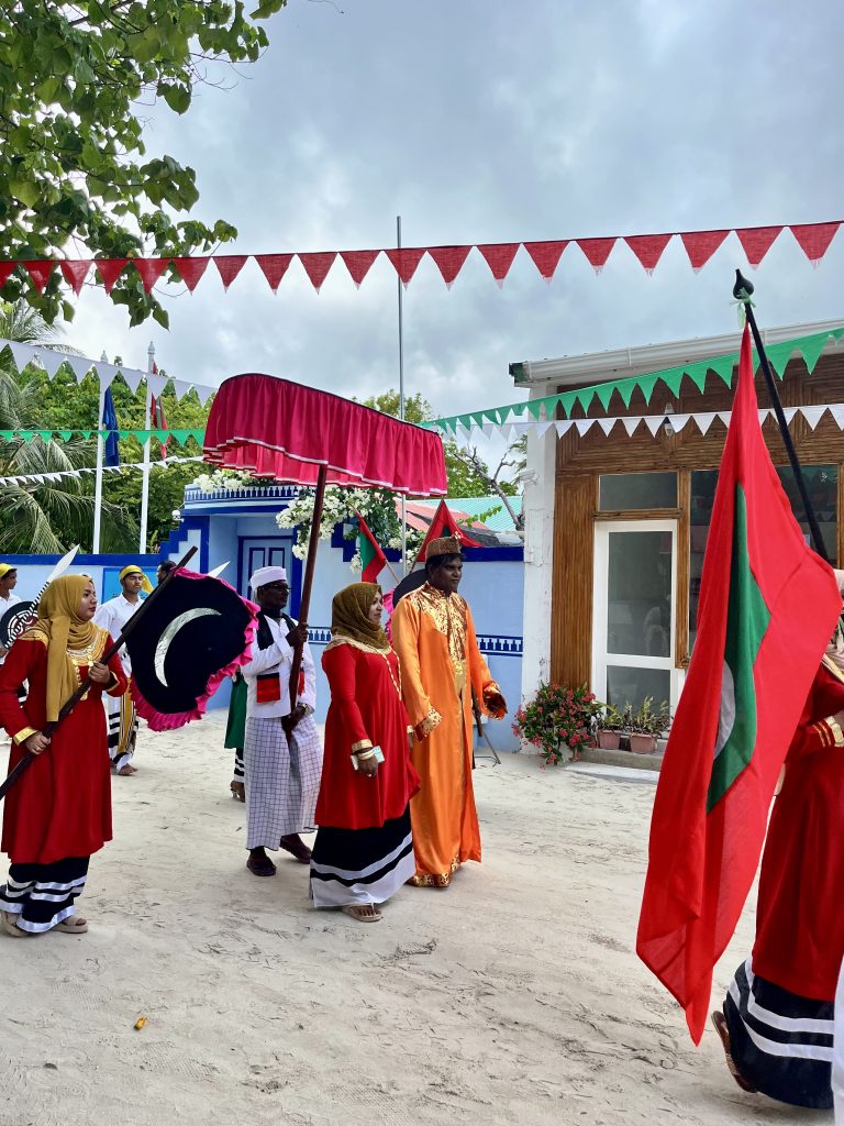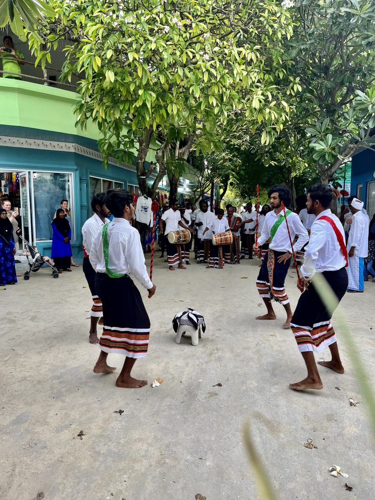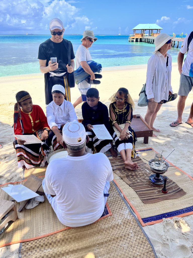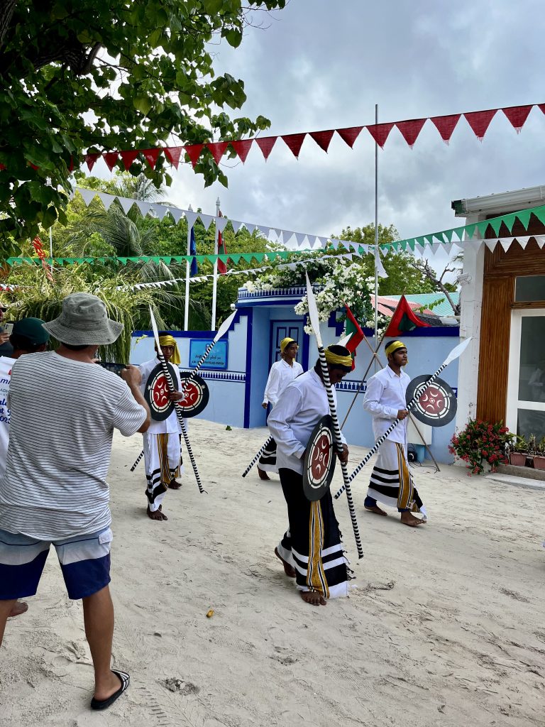 Heute werden wir auf Dhangethi empfangen. Doch diesmal läuft die Zeremonie ganz anders ab. Ein großes, altes Fischerboot ist wunderschön geschmückt und mit Tänzern, Trommlern und Sängern besetzt. Es fährt zwischen unseren Booten umher, Gesänge und Trommelklänge wehen zu uns rüber. Sehr schön anzusehen und zu hören.