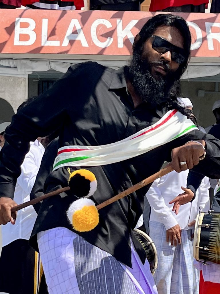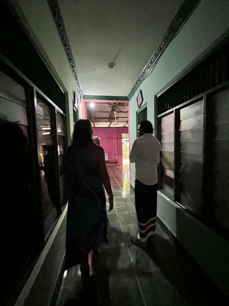 Während der Prozession laufen nicht nur wir, sondern auch einige Touristen und natürlich auch Einheimische mit. Also großes Gewühle! Und trotzdem schafft es Ibrahim immer wieder, plötzlich neben mir aufzutauchen. Auch die Mädels aus meiner Gruppe laufen mit mir. Ich bewundere sein, von den Frauen hier, aus Palmenblättern gebasteltes Armband. Er macht es sofort ab und Tristans Frau, die Kolumbianerin streckt sofort ihren Arm hin. Wem bindet er es um? Mir. 🙈 Hilfe…. Die Prozession führt uns auf die andere Inselseite zum festlichen Dinner. Vom Festplatz bis hier, sind es aber auch nur gut 100 Meter. Man kann fast von Wasser zu Wasser gucken. Wir setzten uns zusammen mit den Österreichern an einen Tisch unterm Sternenhimmel und Ibrahim sitzt einen Tisch weiter….