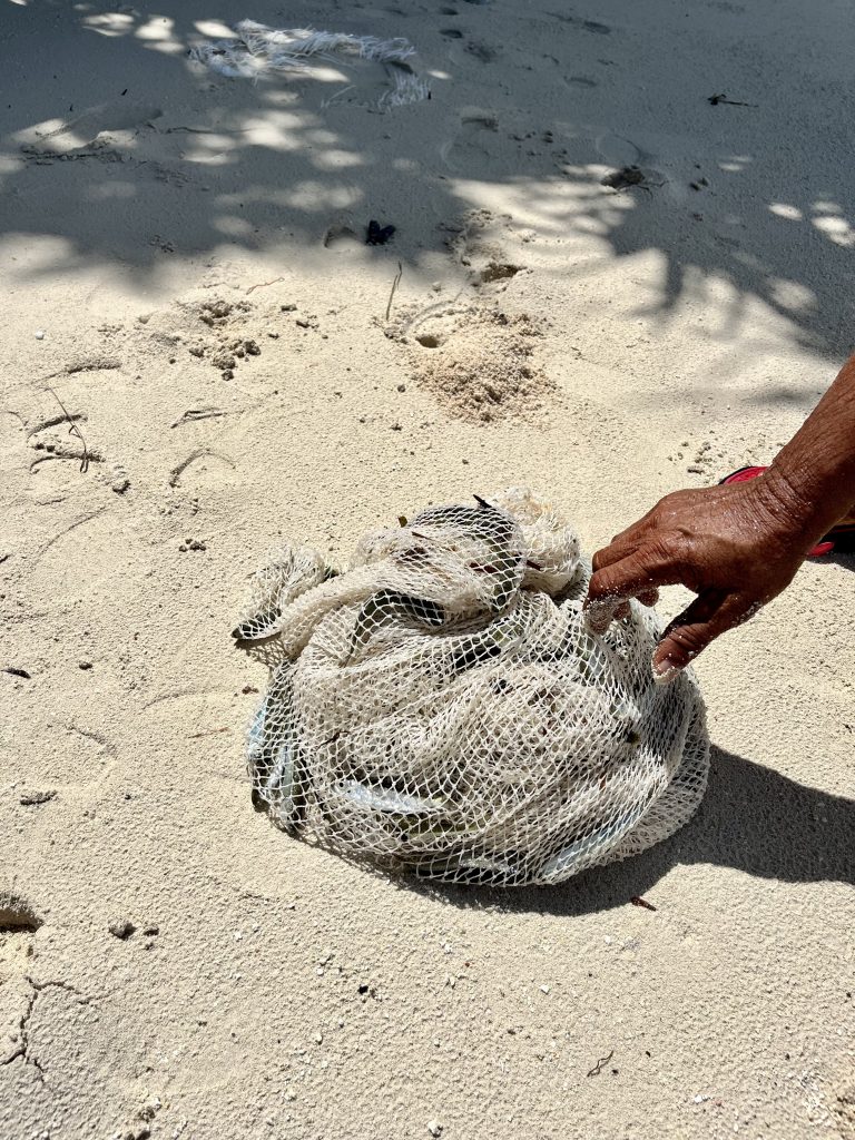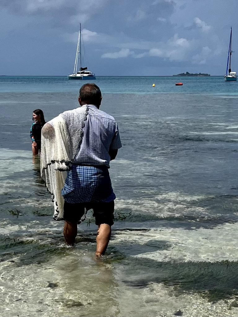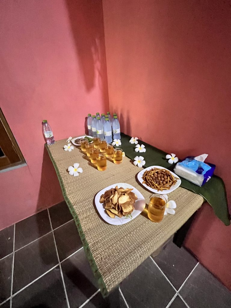 Wir bekommen Kokosnusssaft, kühle Erfrischungstücher mit Blümchen gereicht und eine aus Palmenblättern gebastelte Rose. Dann dürfen wir uns setzen. 😅 Da fällt Klaus ganz plötzlich auf, sein Handy ist nicht in seiner Hosentasche. Ich habe es auch nicht, und leichte Panik macht sich bei ihm breit. Sein Handy, sein Leben! 🫣 Ich meine mich aber erinnern zu können, dass ich es zuletzt auf unserem Außentisch unseres Bootes gesehen habe. Klaus lässt es keine Ruhe, er leiht sich das aufblasbare Kanu der Österreicher aus, sie hatten es schon in der Frühe am Strand geparkt, und paddelt zurück zum Boot. Wir anderen dürfen nach der Begrüßungsrede mal wieder die traditionellen Gewerke der Handwerker und Handwerkerinnen bestaunen und intelligente! Fragen stellen.