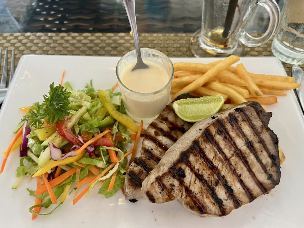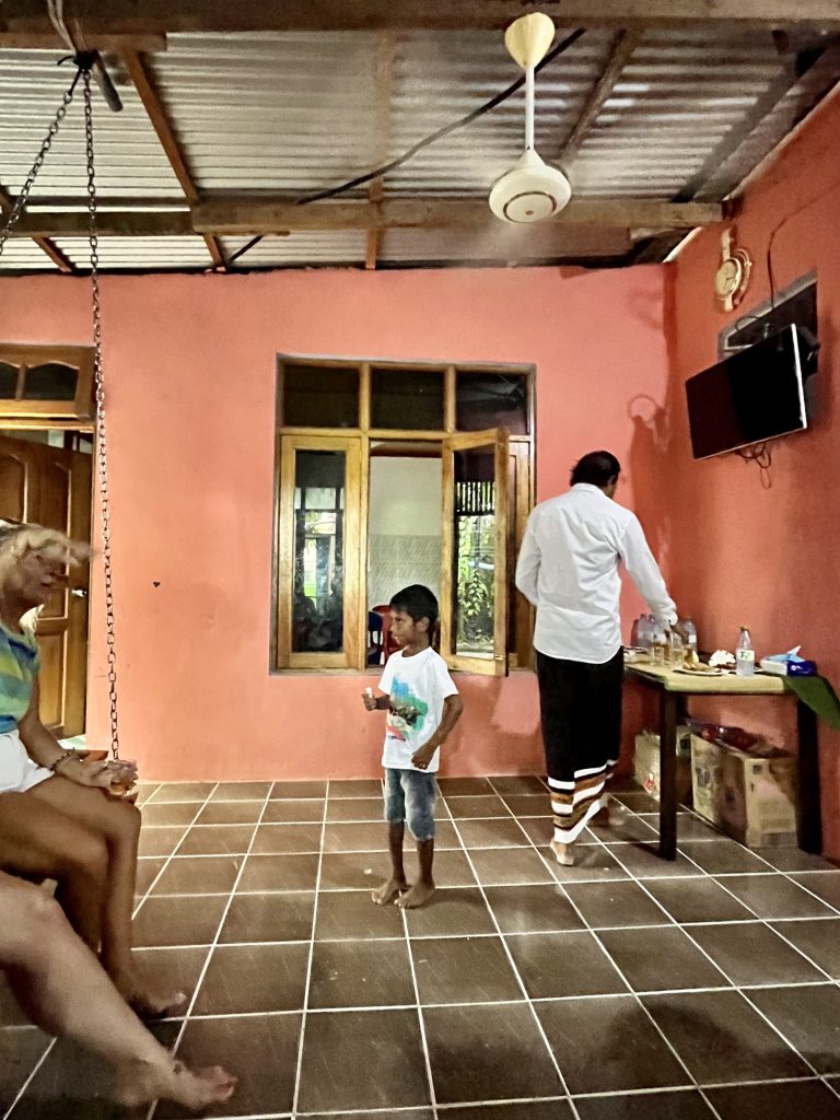 Dann liegen wir in Hängeschaukeln und warten auf die Mittagszeit. Um 13:00 Uhr dürfen wir dann zu den Lokalen. Ibrahim wartet, in kleiner Entfernung. Klaus und ich möchten wieder in das Restaurant von gestern, die Österreicher auch. Wir sitzen am Tisch, plaudern mit der netten Bedienung, ein junger Singhalese, der wegen Arbeitslosigkeit sein Glück auf den Malediven versucht. Da ploppt plötzlich wieder Ibrahim auf. Ob es uns gut gehe…? Ja klar, hä?!