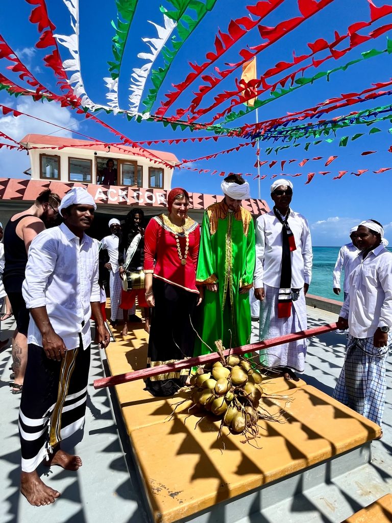 Das Festboot legt mit uns am Steg an, wo Ibrahim ein wachsames Auge auf die Zeremonie hat. Alles was mit Wasser zu tun hat, fällt in seinen Verantwortungsbereich. Ganz schön viel Last auf seinen Schultern! Ein Kokosnussfruchtstand wird als Gabe aufs Boot gebracht, auf dem währenddessen ein Sultan aus unserer Mitte gewählt wurde, samt königlicher Gattin.