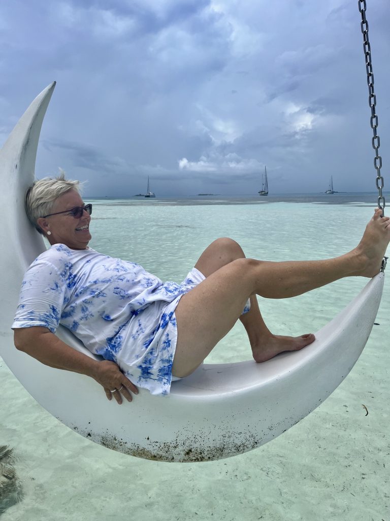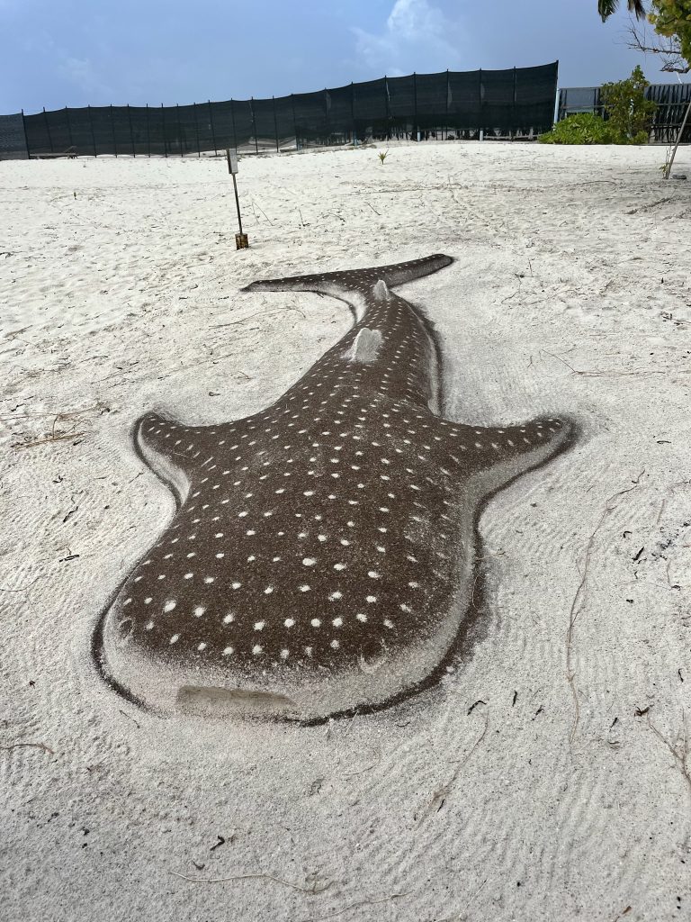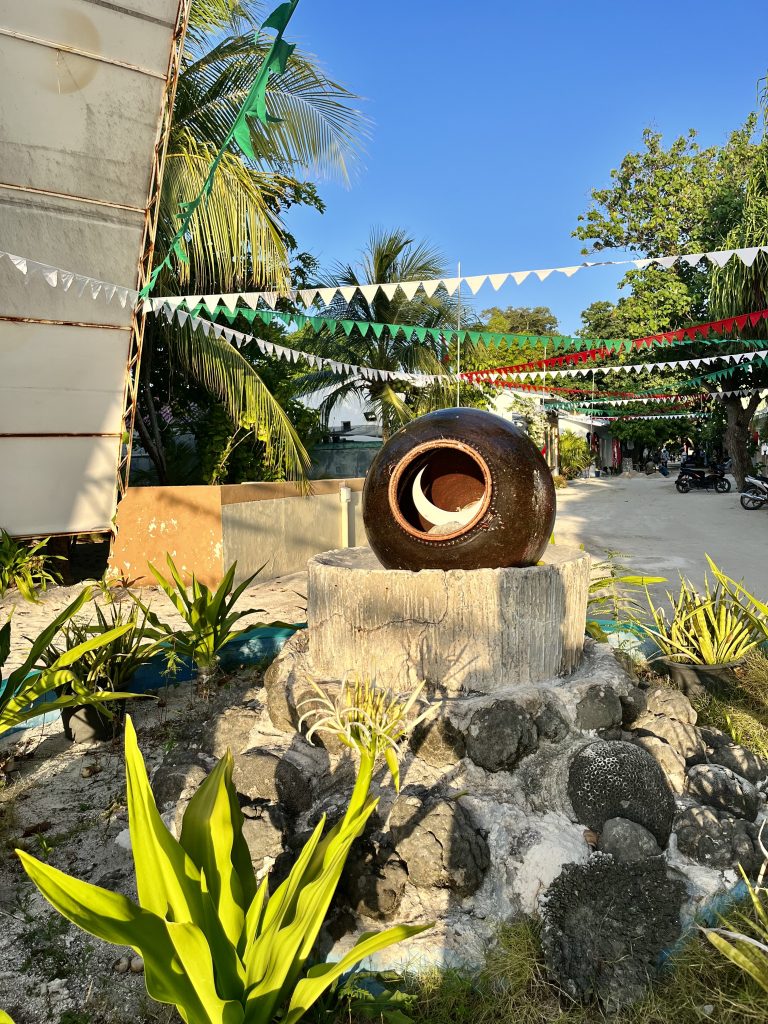 Zu allererst fällt der Blick auf den gefangenen Mond von Dhangethi. Eine eher peinliche Geschichte, aber über die Zeit zu einem Markenzeichen dieser Insel geworden. Wir sind bereits im Bilde, Addy hat uns schon davon erzählt.