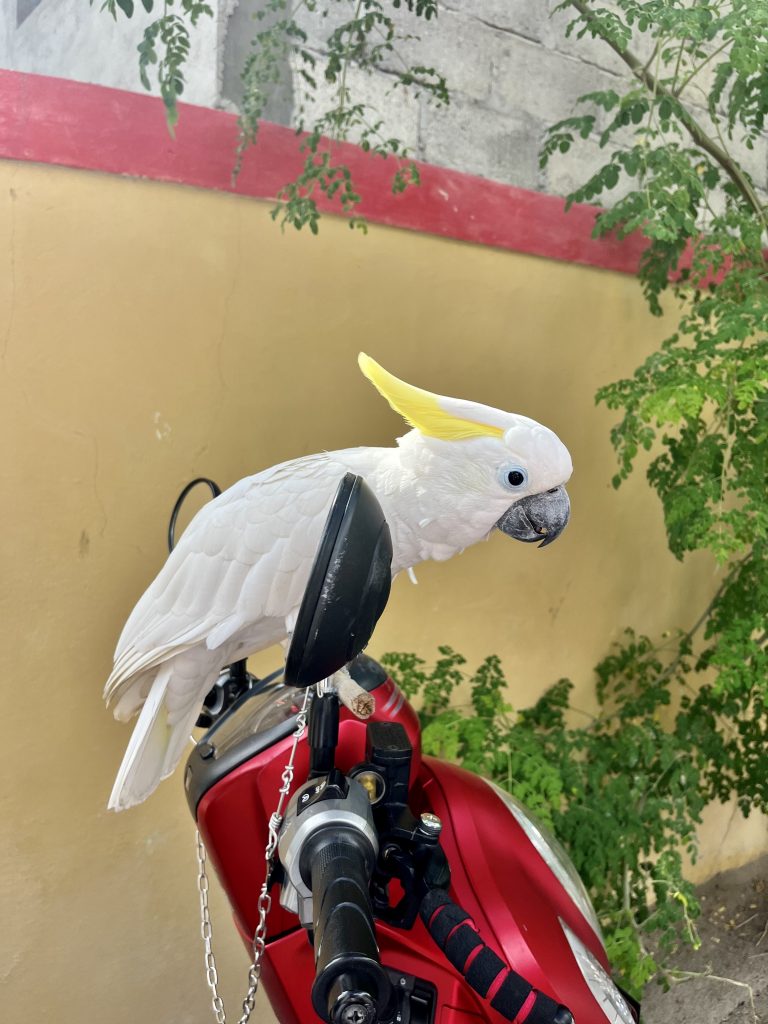Jeder bestellt was er will, wir bezahlen wieder selbst, da, wie der Kasper aus der Box, steht Ibrahim erneut am Tisch und will wissen, ob wir noch was essen wollen? Ne, wir haben bereits gezahlt, verabschieden uns von dem netten Kellner und finden uns, wie gewünscht, um 14:15 Uhr am Festplatz ein. Dort sollen wir einen großen Kreis bilden und jeder ein Zettelchen ziehen, mit einem Namen darauf. Dann sollen wir uns bei dieser Person einfinden und die Inseltour absolvieren. Klaus zieht eine Frau und ich? Man ahnt es wohl schon, ich ziehe Ibrahim. 🙄 Nun ja, ich bin ja nicht allein. Eine Amerikanerin, eine Australierin und die Partnerin von Tristan, aus Kolumbien und eine Engländerin ziehen ihn auch, und so zieht Ibrahim mit 5 Frauen ( 🥳) von dannen. Die Insel gefällt mir richtig gut. Die sandige Hauptstraße gleicht einer Allee, denn lauter weiß blühende und herrlich duftende Bäume beschatten diese. Überhaupt ist die Insel sehr grün.