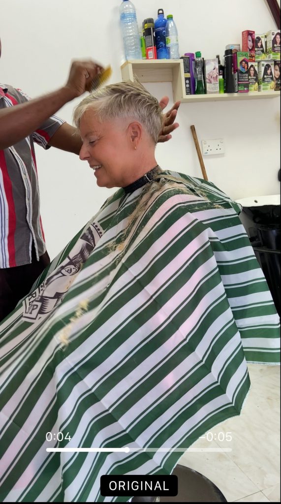 Dann tschüss bis später, jetzt geht’s zum Barbier. Auf dem kurzen Weg dorthin, müssen wir an der Klinik vorbei und wer kommt genau in diesem Moment heraus? Na klar, Ibrahim… Er bleibt wie angewurzelt stehen und ist total verdattert. Wir begrüßen ihn freundlich per Handschlag, er lässt meine Hand gar nicht mehr los und ist fast sprachlos. Schnell erzählen wir ihm, dass ich jetzt zum Barbier müsste. Aha, wenn wir was bräuchten, sollen wir es ihn wissen lassen, stottert er sehr verlegen und geht schnell wieder rein, in sein Krankenhaus. Das hört sich immer so groß an, ist aber nur ein kleines Haus. Aber immerhin! Selbst aus Malé kommen Patienten, da sie hier nicht so lange auf einen Termin warten müssen. Gut, ab zum Barbier. Der hat auch nur ein Minilädchen, mit nur einem Stuhl. ✂️ Schnipp, schnapp, die Haare ab.