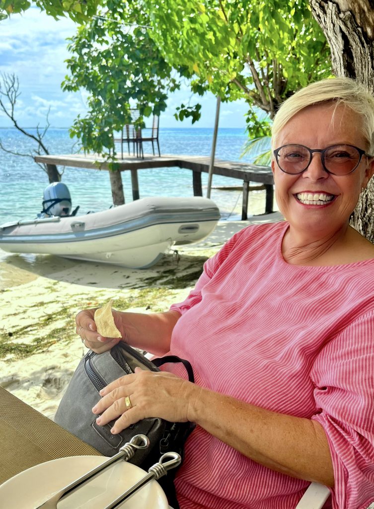 Sein Freund kommt dazu. Ob sie wohl Fotos machen dürften, sie mit dem Dinghy. Klar doch! Sie erzählen noch mehr von sich. Sein Freund ist älter, verheiratet und hat drei! Kinder. Und mit Geld kann er nicht umgehen. Das übernehme Dhanushka für ihn. Sobald der Lohn kommt, nimmt er alles an sich und teilt ihm auch die Zigaretten ein. Vier am Tag, mehr gibt’s nicht. Er ist wirklich goldig. Er sagt immer Mom zu mir. Seine Mutter sei in meinem Alter. Na gut, dann bin ich eben jetzt Mom. 😆 Verheiratet ist er auch, aber Kinder hätten sie noch keine. Gut so! Jetzt bestellen wir unser Essen und lassen es uns schmecken. Leider hat Klaus irgendetwas nicht vertragen und bekommt eine fette, allergische Reaktion. So schlimm hatte er es schon Jahre nicht mehr. Mindesten 5 Mal muss er sich übergeben 🤮 und sitzt lange wie ein Häuflein Elend auf der Bank. In Ruhe soll man ihn lassen, bloß in Ruhe. Dhanushka ist ganz irritiert und besorgt. Er möchte ihm ein kleines Gläschen Irgendwas geben, aber Klaus lehnt dankend ab. Wir brauchen halt Geduld. Nach ner guten halben Stunde, wird es langsam besser. 😅
