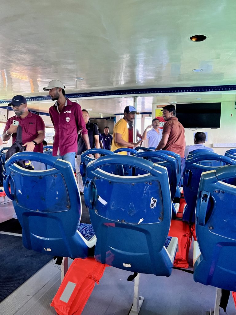 Nun geht es aber zurück. Wir können Dennis ja nicht bei Dunkelheit anfordern. Und wir wollen auf Hulhumalé noch Lebensmittel einkaufen. Also ab zur Fähre. Da kommt sie schon. Das passt ja!
