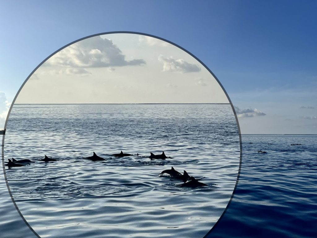 O-Ton Klaus: Huch, was kommt denn da für ein bebrilltes Ungeheuer mit Schnorchel? Ich habe sie gehört, Andrea! Das Piepsen, so toll und höchstens 5 Meter von mir entfernt. Ich glaube aber, dass sie wieder zurück kommen. Lass uns mal warten… Und sie kommen zurück, Andrea, sie kommen!!! Und ich erlebe mein bisher allerschönstes Tierabenteuer! Noch schöner als das Zusammentreffen mit den Elefanten auf Sri Lanka. Überall sind sie, diese hübschen Meeressäuger. Neben mir, unter mir und sooo viele, Hunderte! Ich bräuchte nur meine Hand auszustrecken, um sie zu berühren. Ich höre ihr Piepsen, ihr Klickern und Knattern. Sehe sie tauchen und springen. Sehe Mütter mit Babys. Manchmal sind 20 Tiere direkt unter mir, ich kann in ihre Augen schauen. Es ist fantastisch❣️Bestimmt eine halbe Stunde schwimmen wir mit ihnen. Ich bin ganz überwältigt.