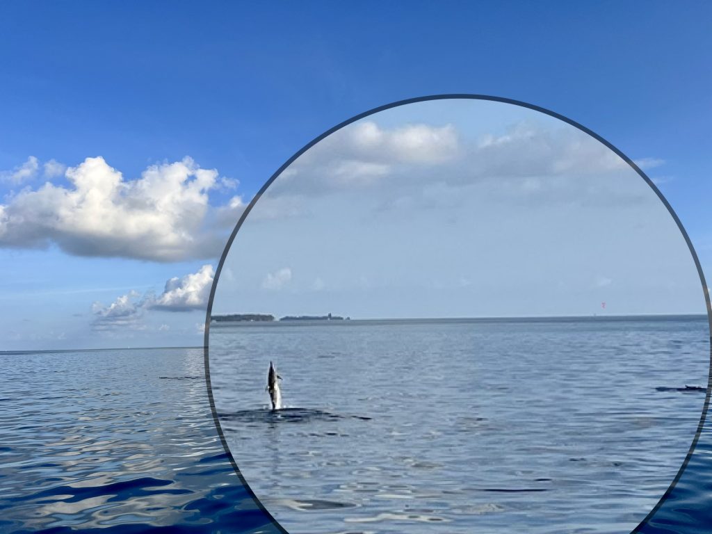 Es sind wieder die kleinen, kompakten Tiere, wie letztes Mal. 50 Stundenkilometer können sie schnell schwimmen. Jetzt sieht es aber eher gemütlich aus, doch Klaus erreicht sie nicht mehr. Er bleibt im Wasser und ich kippe heimlich eine Thunfischdose ins Selbige… 🤫 Die Delphine drehen um und schwimmen wieder Richtung offenes Meer. Jetzt will ich aber auch ins Wasser! Schnell fertigmachen und rein. 💦 Da sind sie auch schon wieder vorbei. Ich schwimme zu Klaus …