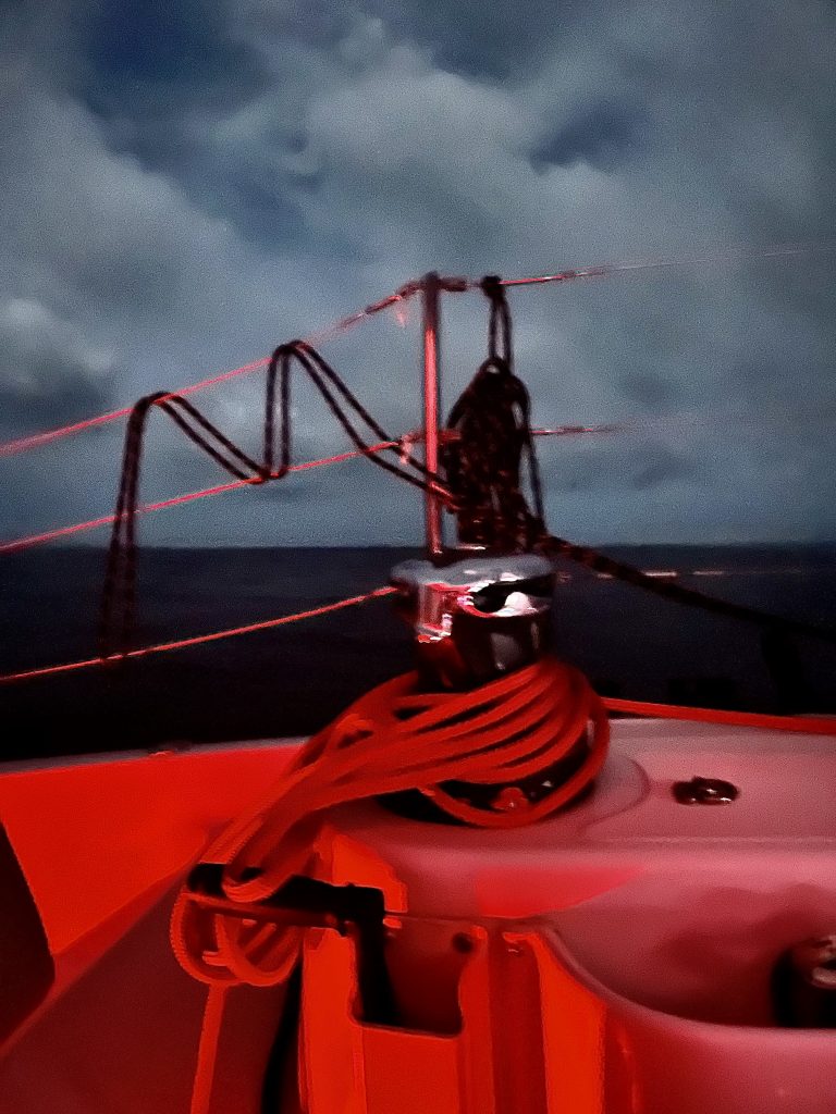 Später am Nachmittag stellt “er” sich doch tatsächlich ein?! Der Südostpassat, jippie! 🥳 Jetzt machen wir richtig gute Fahrt. Das Screecher ist draußen und nun heißt es aufpassen, dass der scheinbare Wind nicht über 18 Knoten geht und möglicherweise noch das Segel zerreißt. Drum Augen auf! Da müsste dann schnell gehandelt werden, wir müssten vom Wind abfallen, um den Druck aus dem Segel nehmen zu können. Es geht in die Nacht. Die erste Wache ist wieder bei mir, die zweite bei Klaus, die dritte wieder bei mir. Und da hat er mich erwischt…