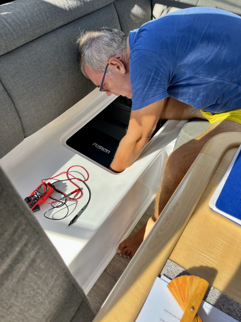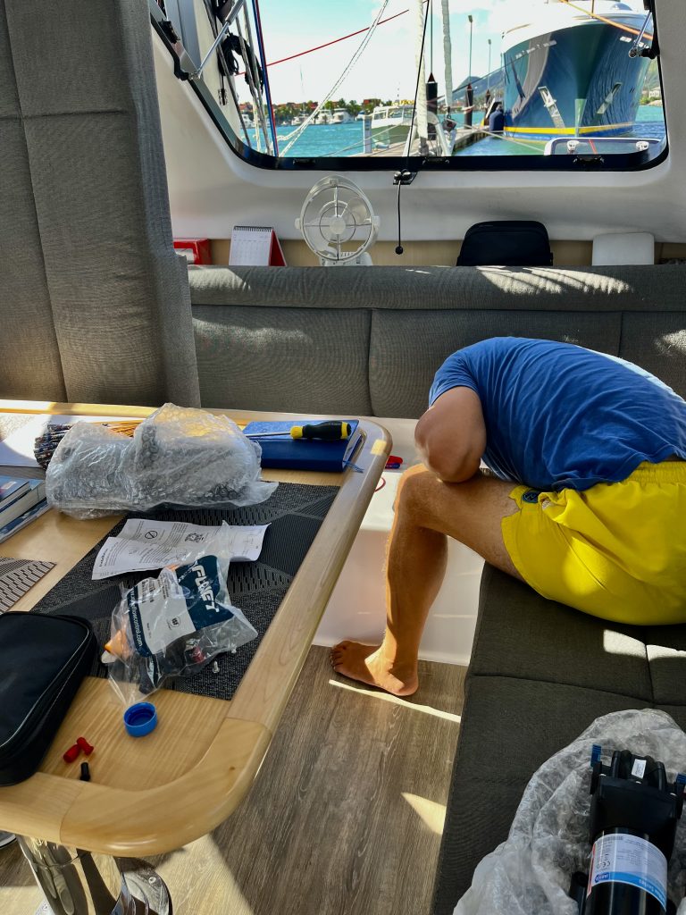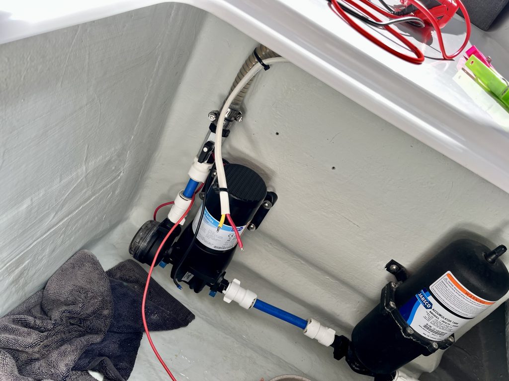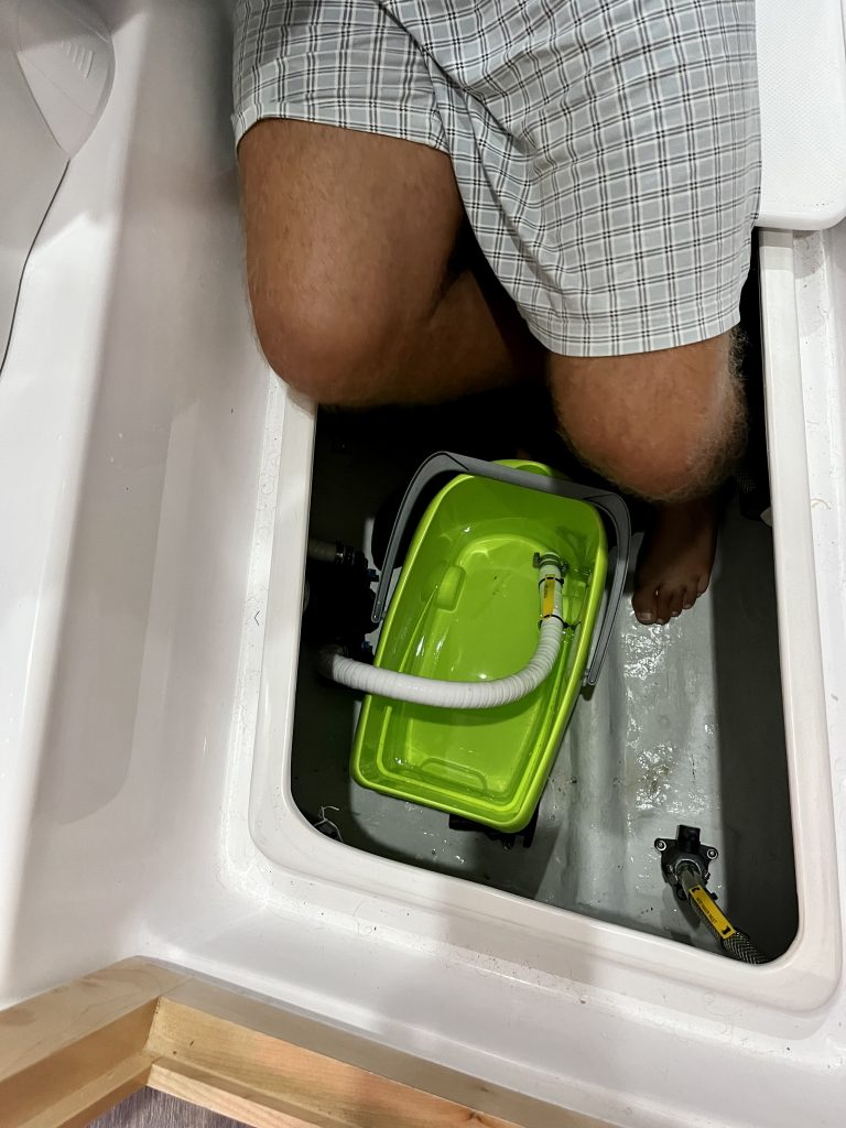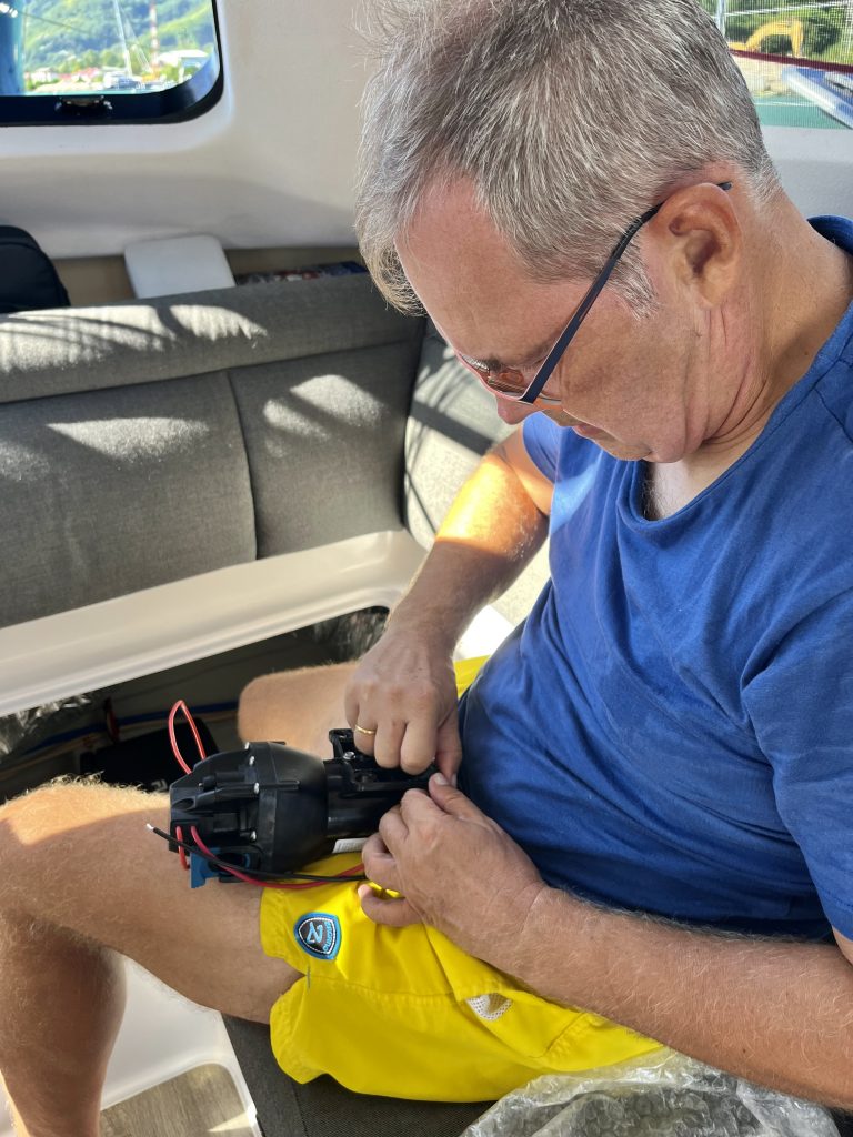 Es ist so lustig! Der klassische Fall! Ein Mann steht unter der Dusche, mein Mann, komplett eingeschäumt und… es kommt kein Wasser mehr. Die Frischwasserpumpe versagt ihren Dienst. Ich reiche ihm erstmal eine Flasche Wasser, ein Foto darf ich nicht machen. Abgewaschen, getrocknet und angezogen, geht es an die Reparatur, bzw. an das Suchen der Ursache.