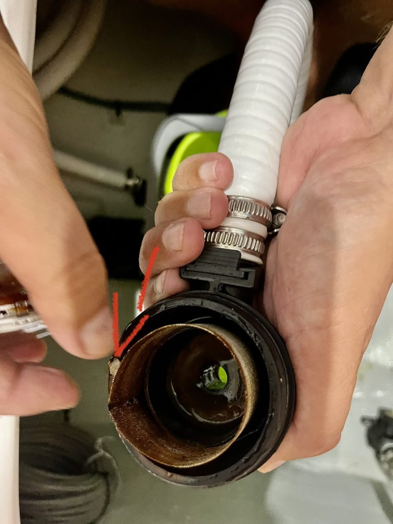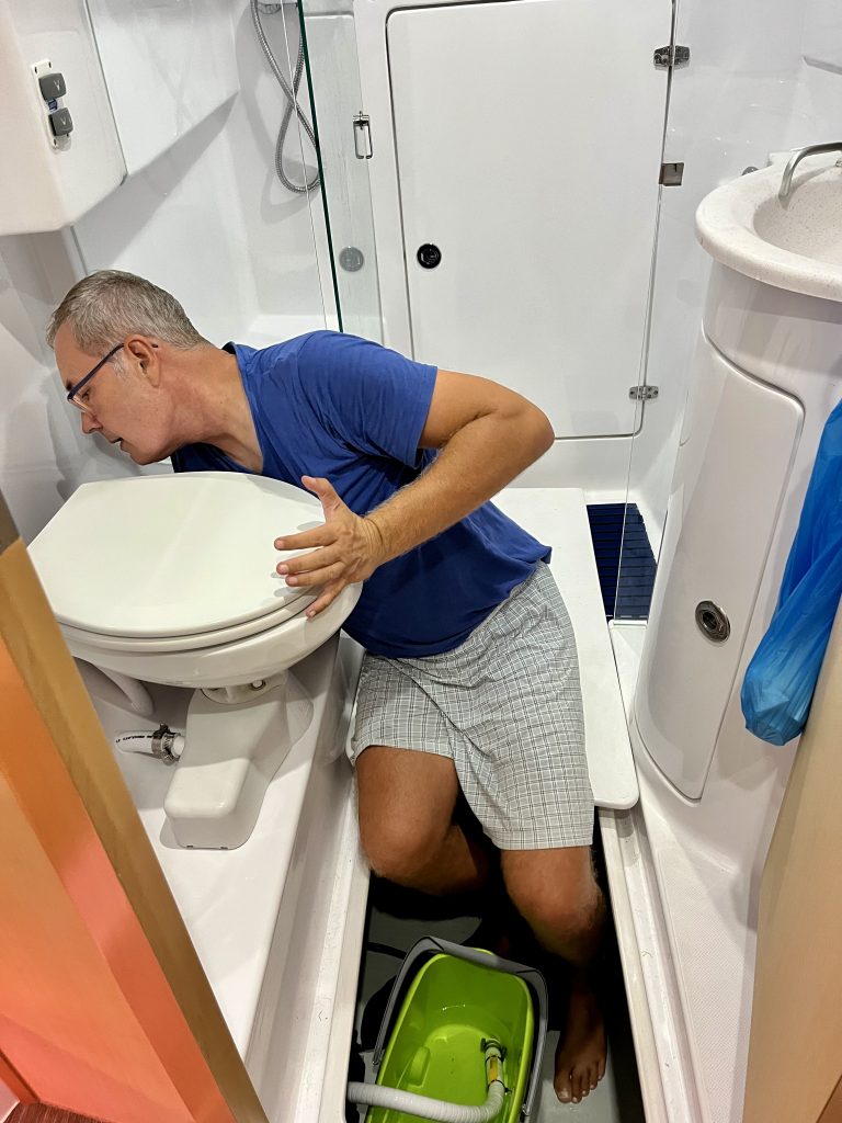 Es geht aber nicht. Wir schwitzen wie verrückt, es stinkt, ich bin genervt, mein Knie tut weh. Klaus ist erstaunlich beherrscht und geduldig. Vielleicht im Kontrast zu mir…? Komisch, es sitzt nichts zu, das Sieb vom Filter ist blitzeblank, auch die Toilettenöffnungen fürs Wasser sind frei, der Zuführungsschlauch ebenfalls… Was kann es nur sein? Die Pumpe funktioniert, daran liegt es hier jetzt nicht. Aus Verzweiflung wird der Filter nochmal auseinander genommen. Da, am Rand zwischen Sieb und Gehäuse, da sitzt doch was!?