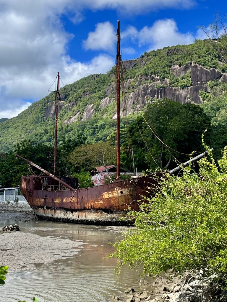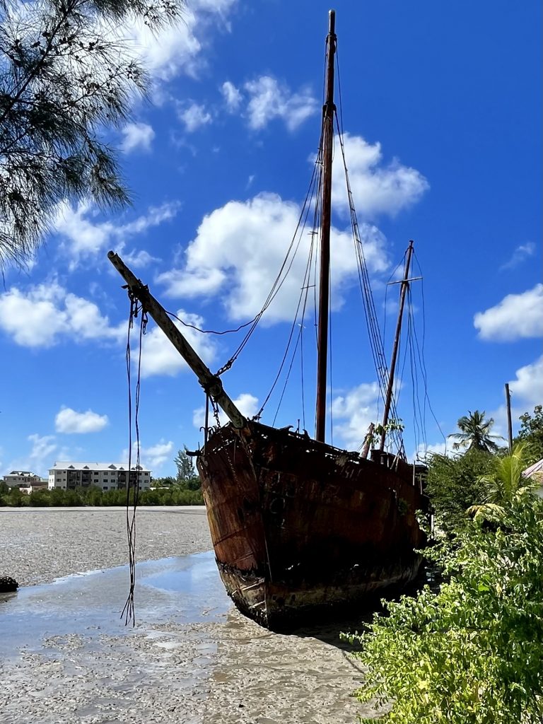 und unterhalten uns nett mit dem dortigen Kellner. Wieder ein Singhalese. Lustig. Schmatzen unsere Sushiplatten auf und düsen mit den Bussen wieder zurück zur Marina. Auf dem Weg von und zur Bushaltestelle passieren wir immer einen kleinen Wasserausläufer, wo am Ende ein großes, völlig verrostetes Schiff seine letzte Ruhestätte gefunden hat.