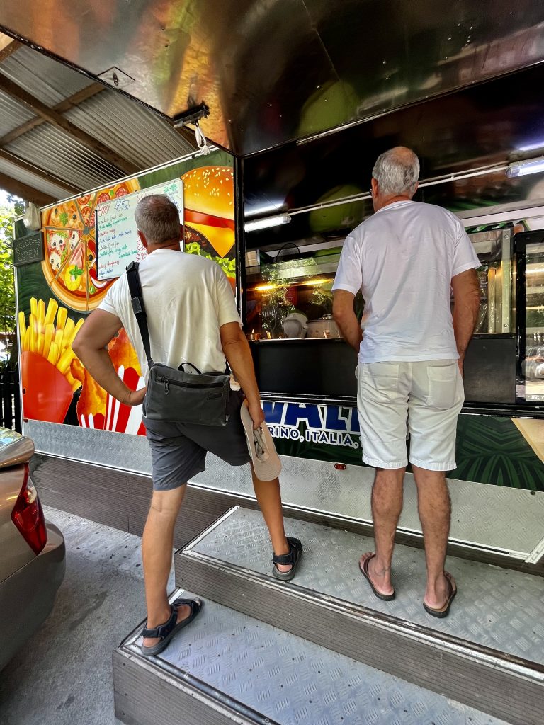 Ahh, da ist er ja, der berühmte Strand. Aber erst einmal muss Klaus unbedingt etwas mampfen.