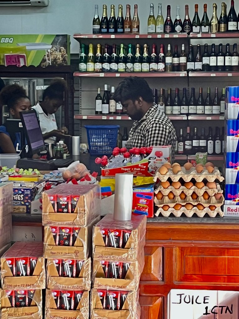 Klaus braucht was zu trinken! Sofort! Mittlerweile fährt er total auf Bitter Lemon ab, aber das hausgemachte. Ja, hier auf den Seychellen gibt’s ne Brauerei für dieses Getränk und das hat Klaus total in seinen Geschmacksbann gezogen. Zum Glück gibt es hier alle paar hundert Meter, einen indisch geführten Minimarkt, der dieses Getränk führt. Dann nichts wie hin.