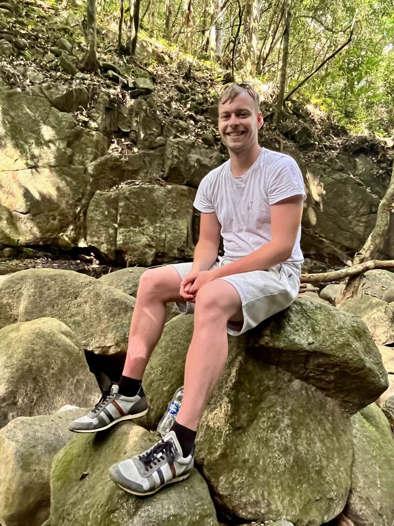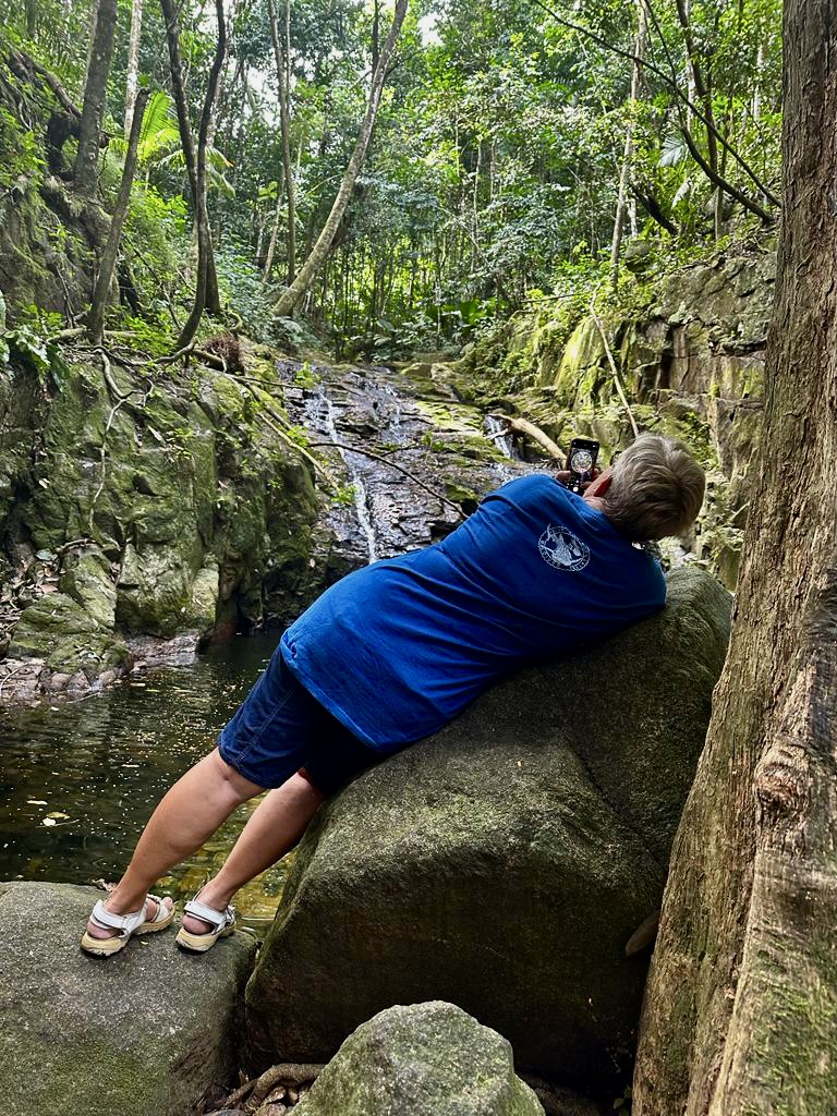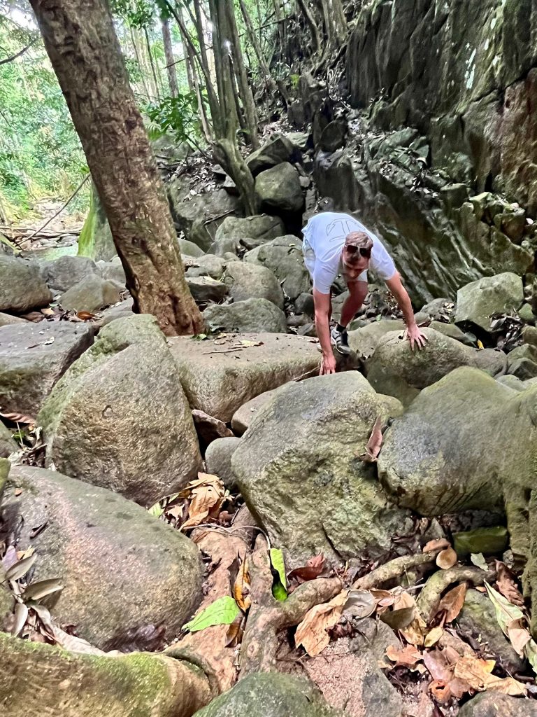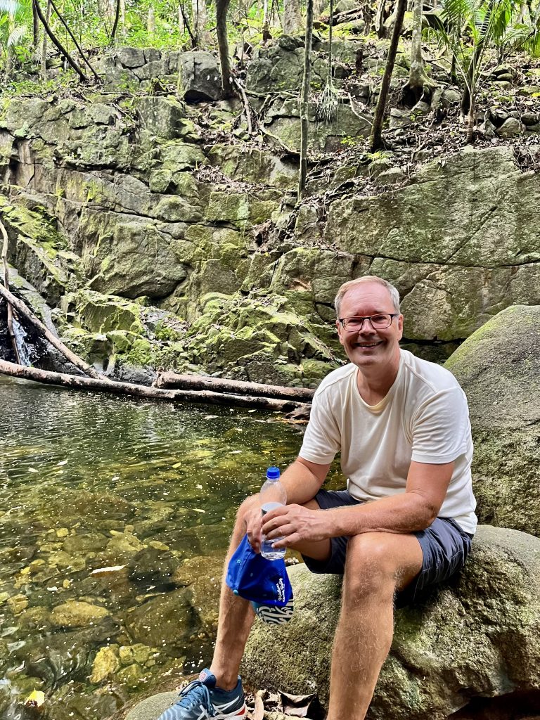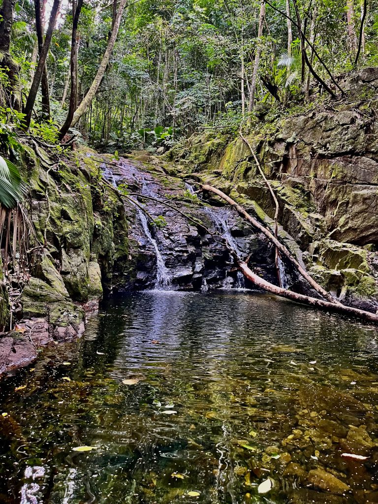 Da geht’s runter und nachher auch hoffentlich wieder hoch. Und dann sind wir am Wasserbecken dieses Falls angekommen, verschwitzt und leicht verdreckt.
