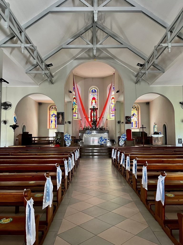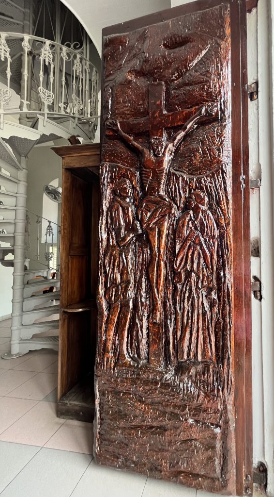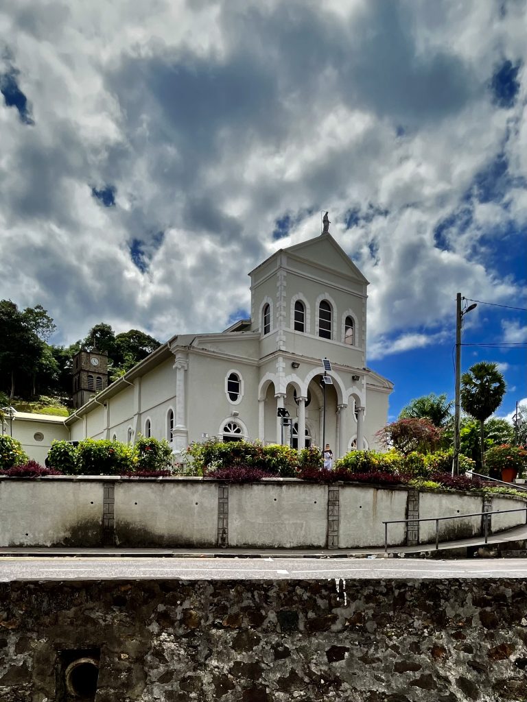 Sie ist das größte, historische Gebäude der Seychellen und ihre beeindruckenden Türen stehen weit offen. Wie übrigens bei allen Kirchen hier.
