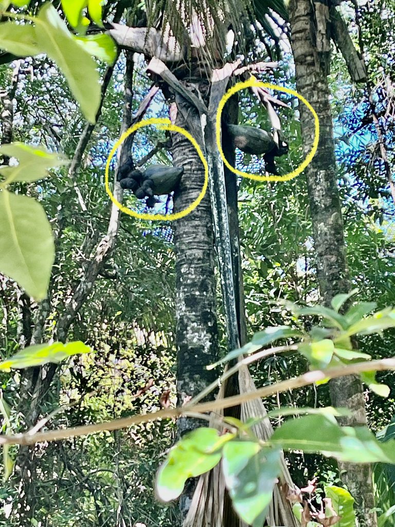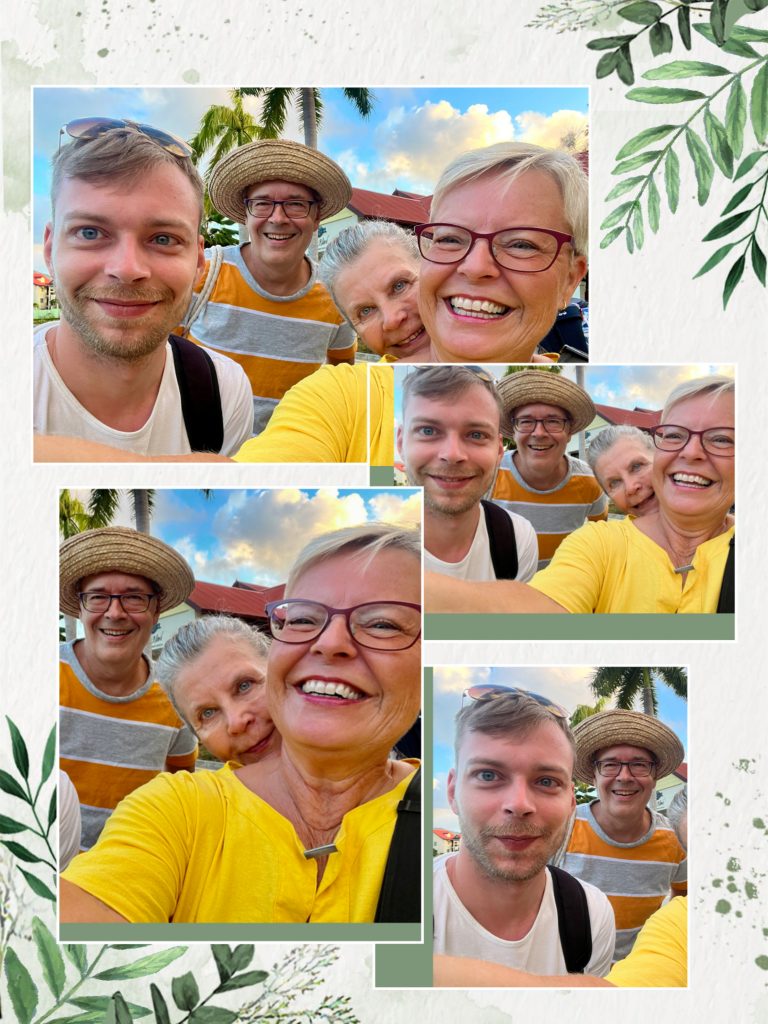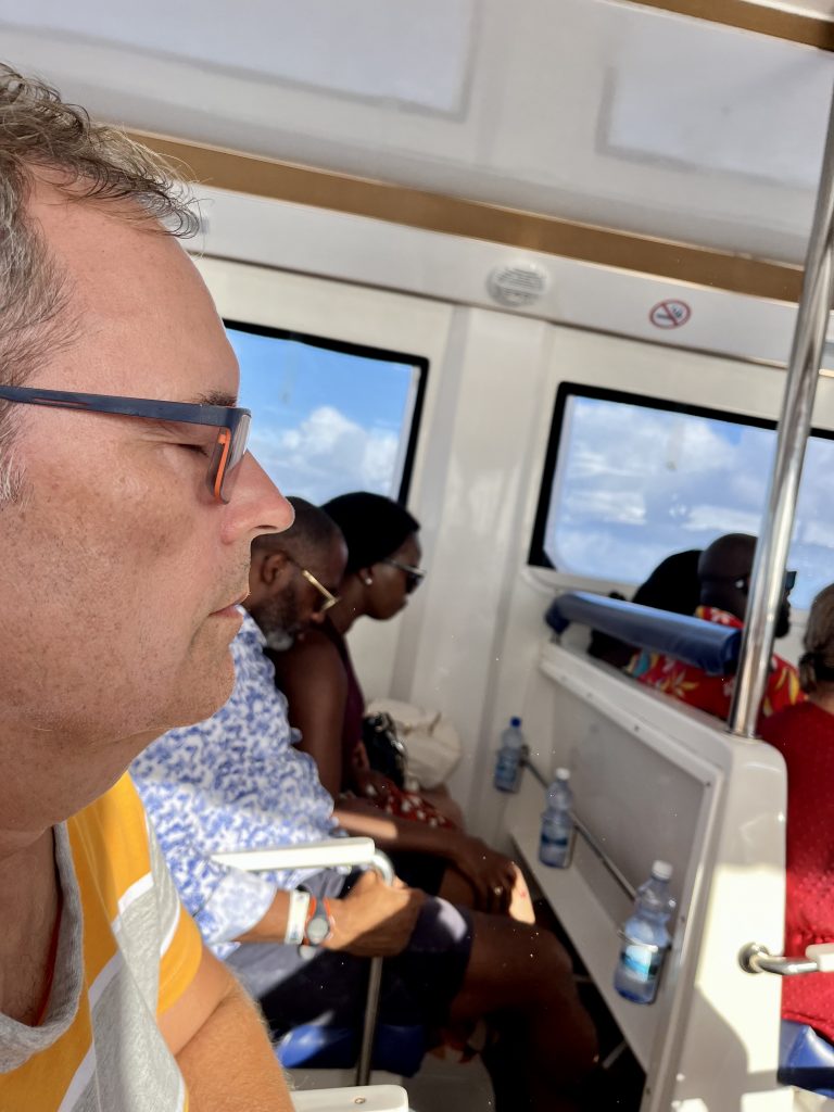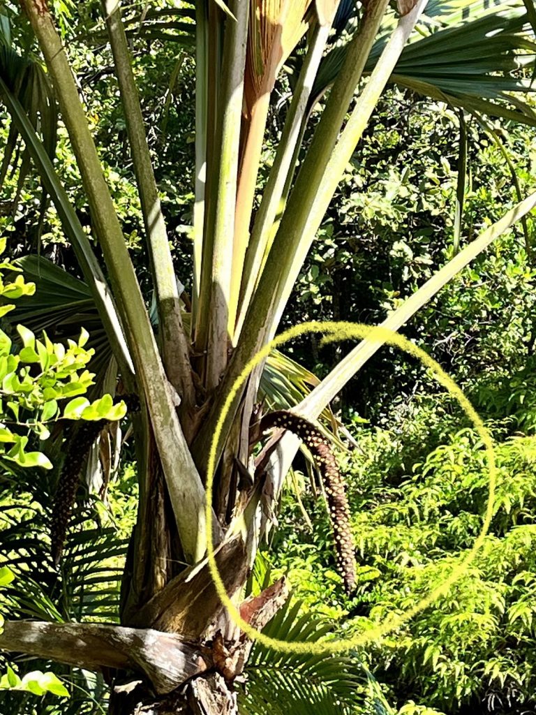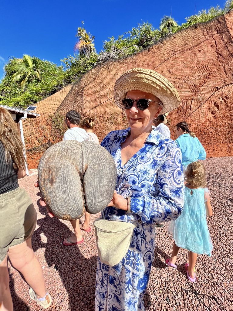 Illustre Geburtstagsgesellschaft. Da kommt das Taxi und fährt uns wenige Meter weiter zum Startpunkt der Tour. Dort heißt es erstmal „Paperwork“. Eine gestrenge Lady ruft nach und nach die Mitreisenden auf, kassiert ab und verteilt unterschiedlich farbige Gummiarmbänder. Dieses Procedere dauert, bestimmt ne Stunde, dann geht’s aufs Schnellboot. Oh je, wir müssen wieder die Schuhe ausziehen. Das mag Janek so gar nicht, ich auch nicht. Ist aber wohl überall so Sitte… Wir suchen uns Plätze, und ab geht die Speedbootfahrt. Eine Stunde und zwanzig Minuten brettern wir übers Wasser, manch harte Welle schlägt uns ins Kreuz, einige übergeben sich. 🤮 Wir nicht, auch Marlene nicht, hat sie doch sicherheitshalber wieder eine Tablette Stugeron genommen. Die sehr korpulente Tourbegleiterin weist uns in den Ablauf der Tour ein. Das Boot fasst übrigens 47 Fahrgäste und 4 Personen Crew. Genau so viele sind wir auch. Dann erreichen wir Praslin, das erste Tagesziel. Praslin wird französisch Pralen, ohne s ausgesprochen. Darauf wird Wert gelegt! Gut. Komfortable Vans kutschieren uns jetzt weiter zum Nationalpark. Wir dürfen nun 20 Minuten am Park außen entlang spazieren und Fotos der legendären Coco de Mer machen. In Wirklichkeit werden wir kurz über die Straße geführt und stehen vor einem hohen Zaun, über den gerade mal eine Palme herüber wedelt.