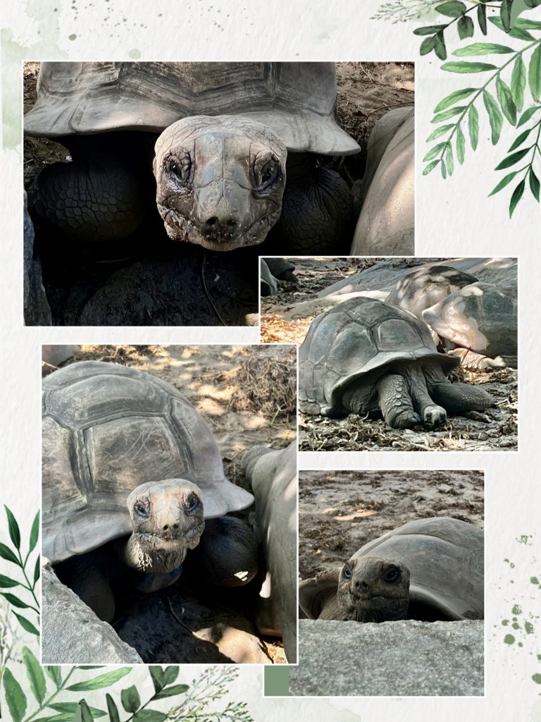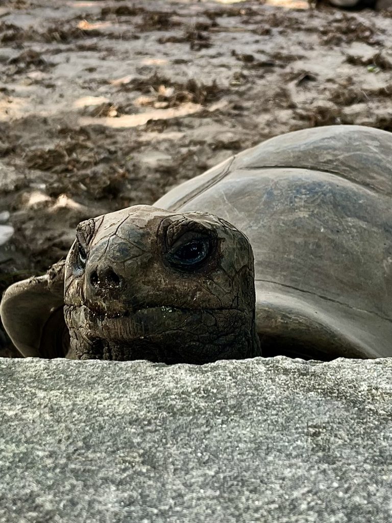 Das Buffet ist sehr überschaubar und einfach. Nachtisch ist nicht dabei und käme extra. Getränke sowieso. Eine gewisse Aggressivität steigt in mir auf, denn die Tour ist schweineteuer! Und der Park mit Stränden und Steinen kostet gleich auch nochmal extra, pro Person. 😡 Nach dem Essen sind wir dann uns selbst überlassen mit der Einschränkung, zwanzig Minuten nach Drei wieder zurück zu radeln, um dann pünktlich um zwanzig Minuten vor Vier im Boot zu sitzen. Ziel ist, um 17:00 Uhr zurück auf Mahé zu sein, damit die Crew auch pünktlich in den Feierabend kommt. Okay, wir radeln dann mal los, zur Anse Source d’Argent. Ein umzäuntes Gelände, wo der besagte Eintritt fällig wird. Grrr… Erstmal gibt’s wieder die obligatorischen Riesenlandschildkröten.