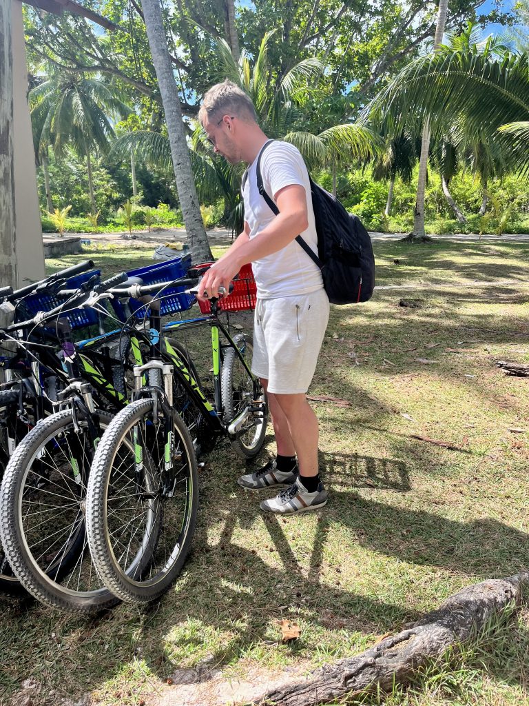 Also sitzen wir etwas länger in den Vans, bis wir das Speedboot erreichen. Schuhe wieder aus, Plätze einnehmen und ab dafür. Das versprochene Wasser steht für jeden bereit und darf für das kommende Mittagessen auf La Digue verwendet werden. Denn Getränke kosten extra! 15 Minuten später legen wir auf La Digue an. Schuhe wieder an und alle, die jetzt Fahrrad fahren wollen, hin zum Verleiher. Machen wir natürlich, andere lassen sich mit einem Transporter weiter kutschieren. Jeder von uns schnappt sich nen schedderigen Drahtesel und gemeinsam strampeln wir zum angegebenen Restaurant.