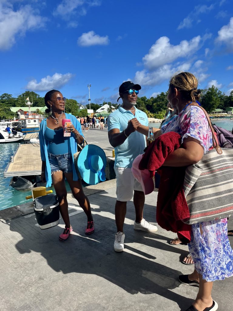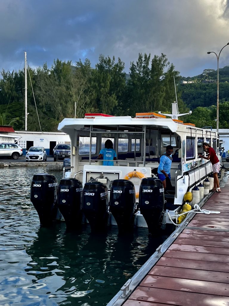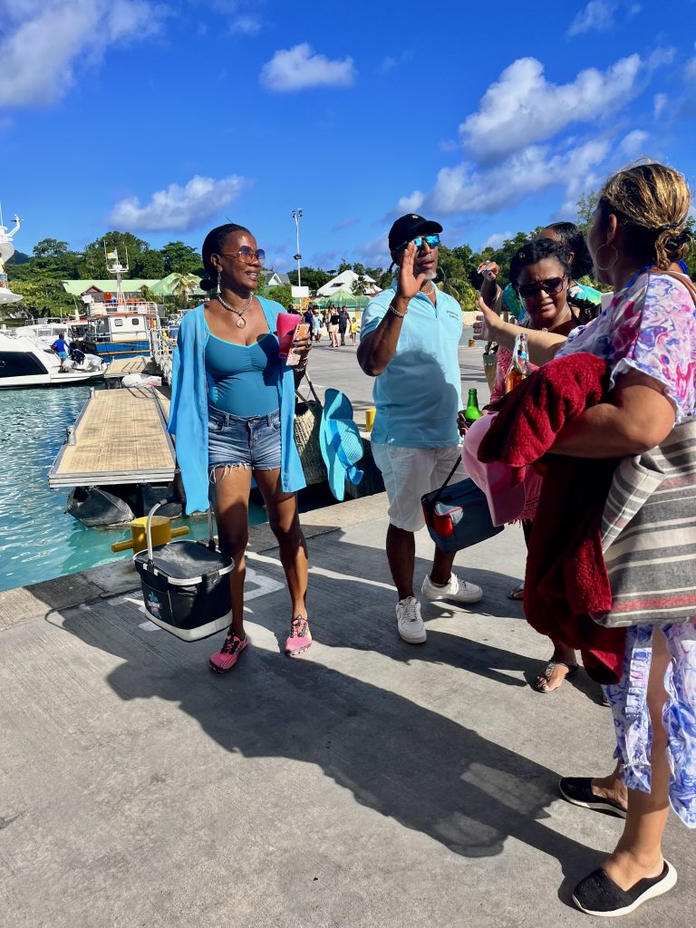 Jetzt heißt es in die Pedale treten, den drahtigen Esel wieder abgeben und hin zum Pier, wo das Boot schon auf uns wartet. Von wegen! Wir warten auf das Boot, dass noch im Päckchen mit anderen Booten verknotet ist und so gar nicht abfahrbereit erscheint. Stattdessen verabschieden sich Locals von Locals, die wohl so etwas wie ein Klassentreffen auf La Digue hatten. Aber sowas von stimmungsvoll!