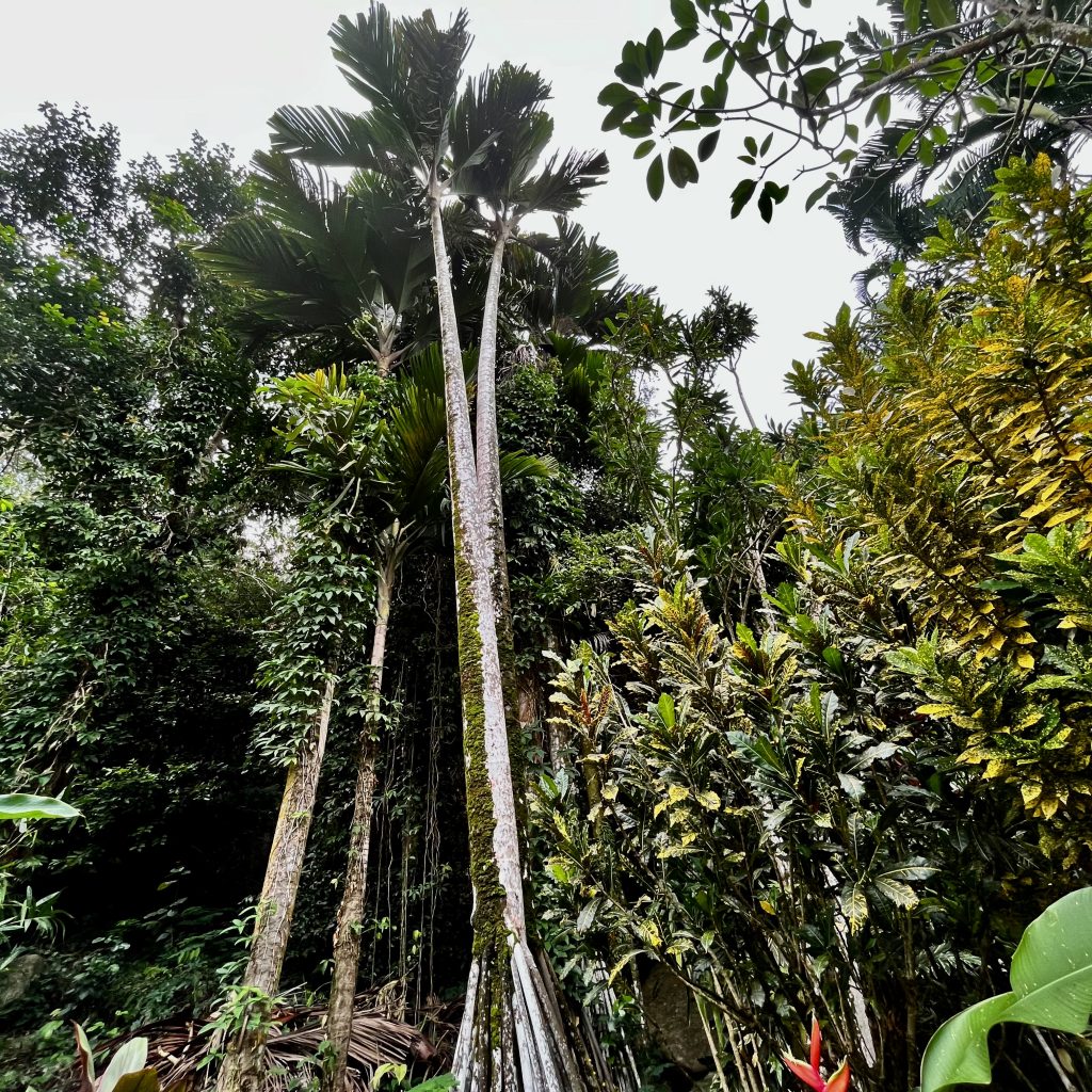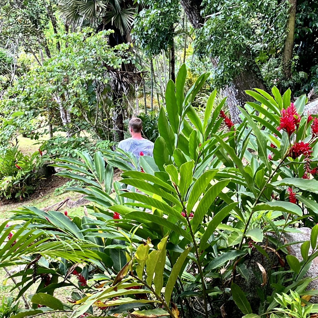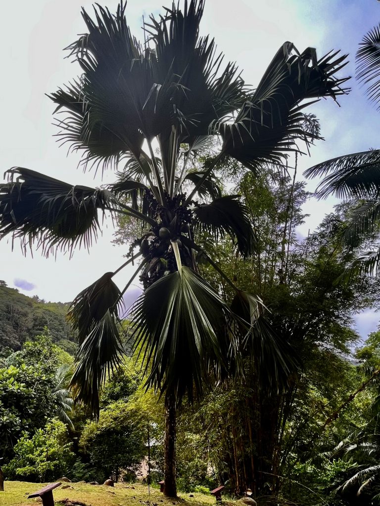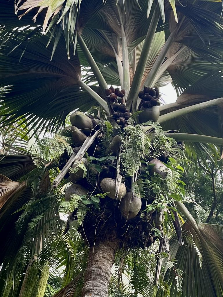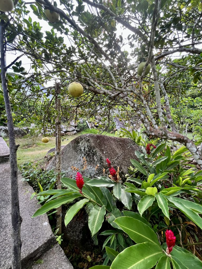 Von Anfang an erfasst mich diese besondere Atmosphäre. Es ist ruhig, sehr friedvoll und irgendwie aus der Zeit gefallen. Oder, wie eine Zeitreise ins 18. Jahrhundert, der Kolonialisten und Gewürzhändler. Wunderbar! Uns erwarten Obstbäume, Gemüsebeete, Kräuter und Heilpflanzen. Auch ein botanischer Garten ist hier verloren gegangen. 25 Hektar in Hanglage, wunderbar angelegt, gepflegt und ausführlich katalogisiert und beschrieben. Wir finden uns dennoch nicht sofort zurecht und irren etwas herum, zwischen Heilpflanzen, Zitronenhainen und Coco de Mer Palmen…