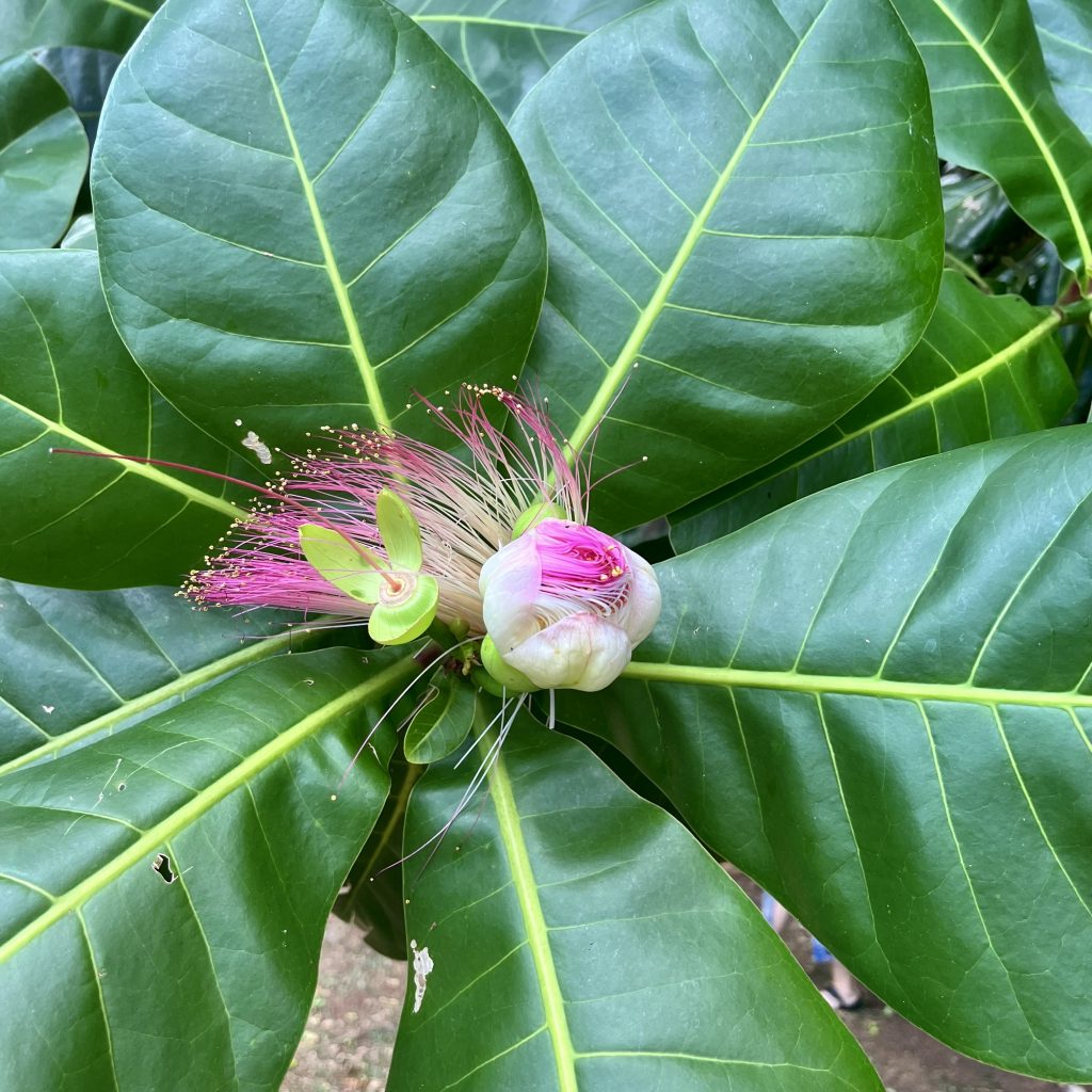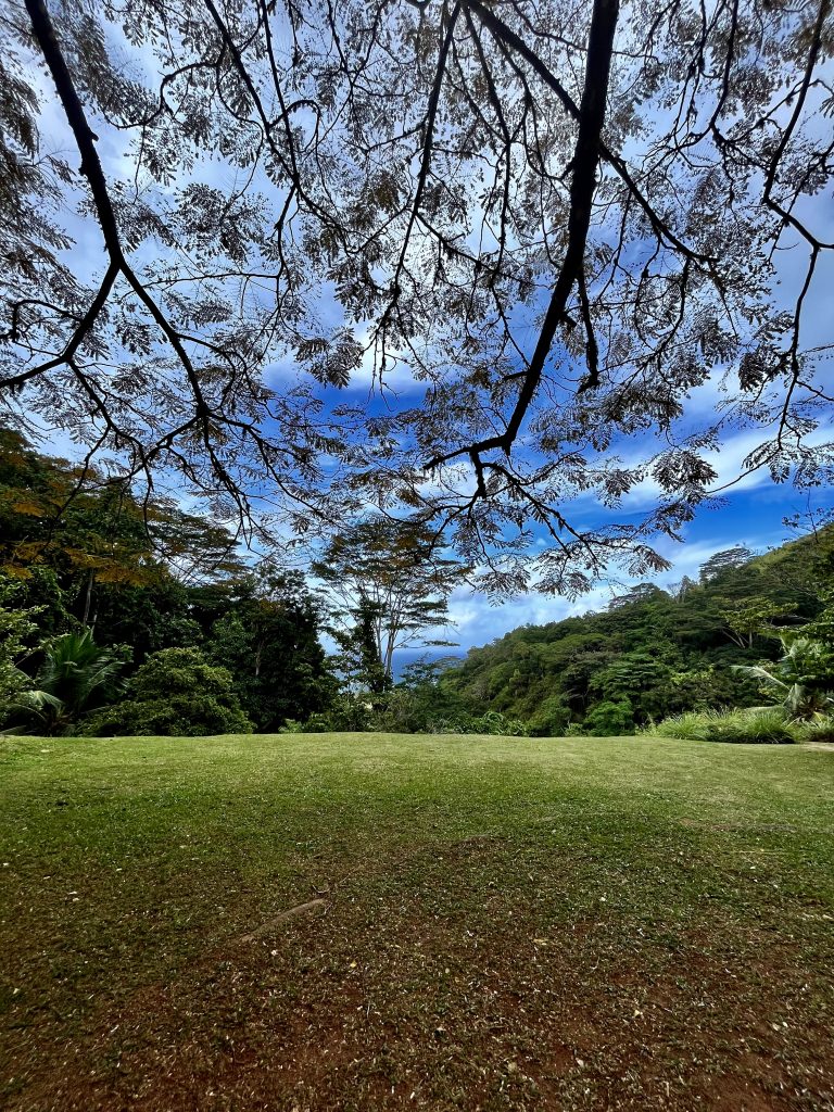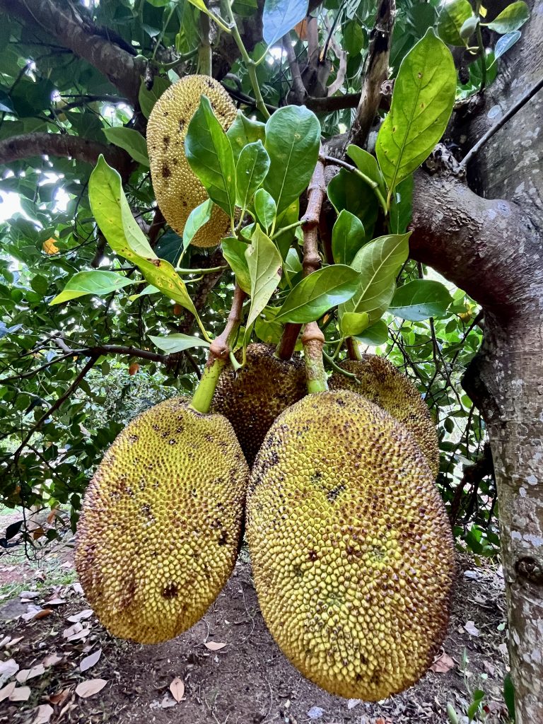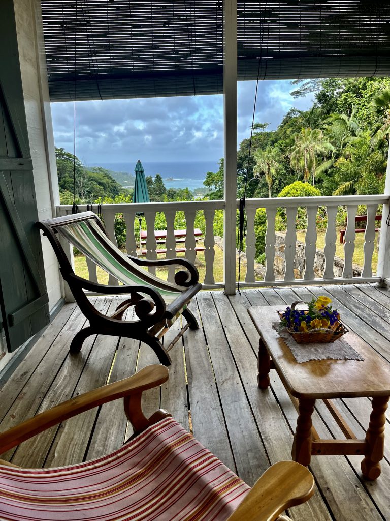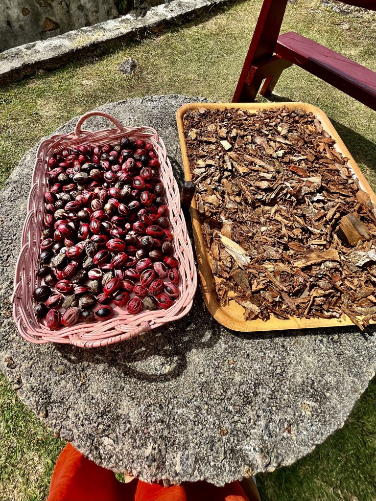 Von Anfang an erfasst mich diese besondere Atmosphäre. Es ist ruhig, sehr friedvoll und irgendwie aus der Zeit gefallen. Oder, wie eine Zeitreise ins 18. Jahrhundert, der Kolonialisten und Gewürzhändler. Wunderbar! Uns erwarten Obstbäume, Gemüsebeete, Kräuter und Heilpflanzen. Auch ein botanischer Garten ist hier verloren gegangen. 25 Hektar in Hanglage, wunderbar angelegt, gepflegt und ausführlich katalogisiert und beschrieben. Wir finden uns dennoch nicht sofort zurecht und irren etwas herum, zwischen Heilpflanzen, Zitronenhainen und Coco de Mer Palmen…