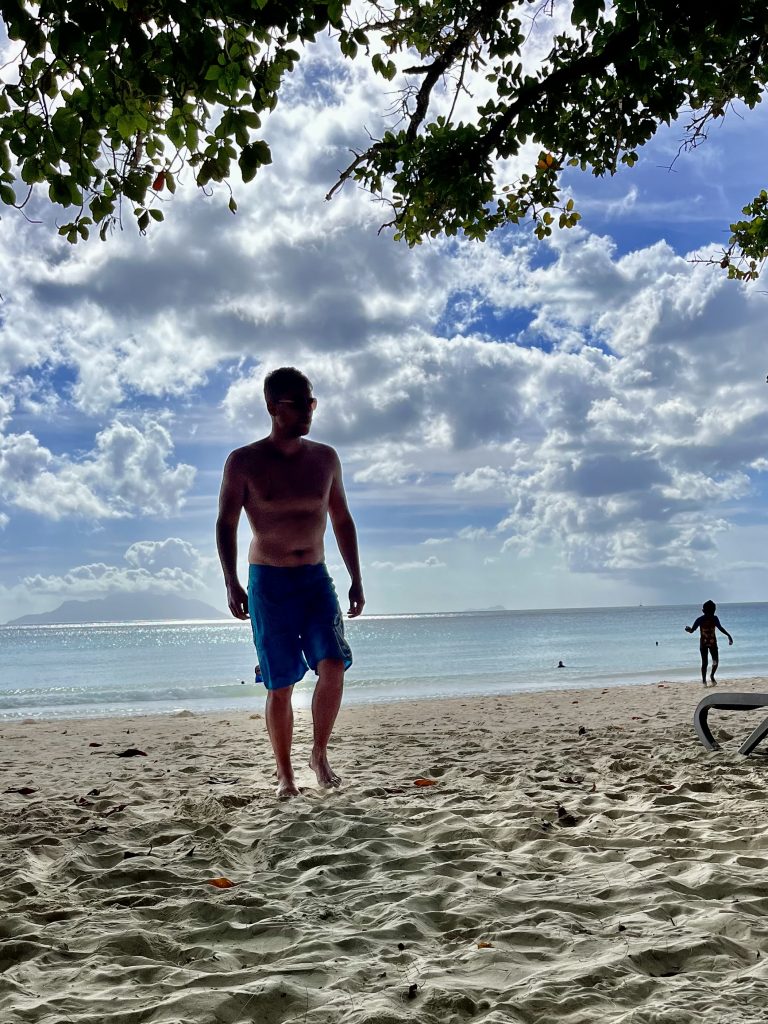 Beau Vallon Bay, das machen wir heute, zusammen mit Janek. Einen schönen, erholsamen Strandtag. Da klinkt sich Marlene aber aus, sie will lieber mit dem Bus nochmal nach Victoria. Auch gut. Beau Vallon ist ja der längste Strand der Seychellen, und hier entwickelte sich in den 1970er Jahren der Badetourismus mit dem Hôtel des Seychelles. Wir lagen ja schon mit unseren Gästen hier vor Anker, aber richtig am Strand, mit Liegestühlen, kühlen Drinks und Eis, waren wir noch nicht mit ihnen. Also ab ins Auto -ja es springt an 🤗- und hin zum schönen Strand.