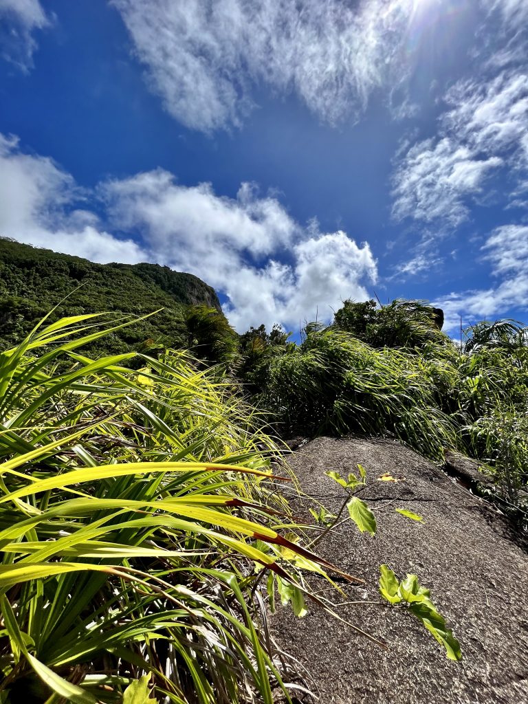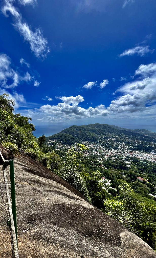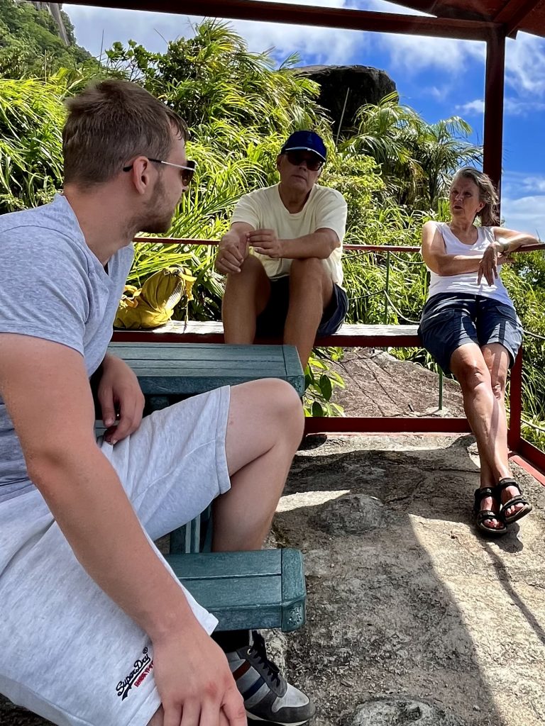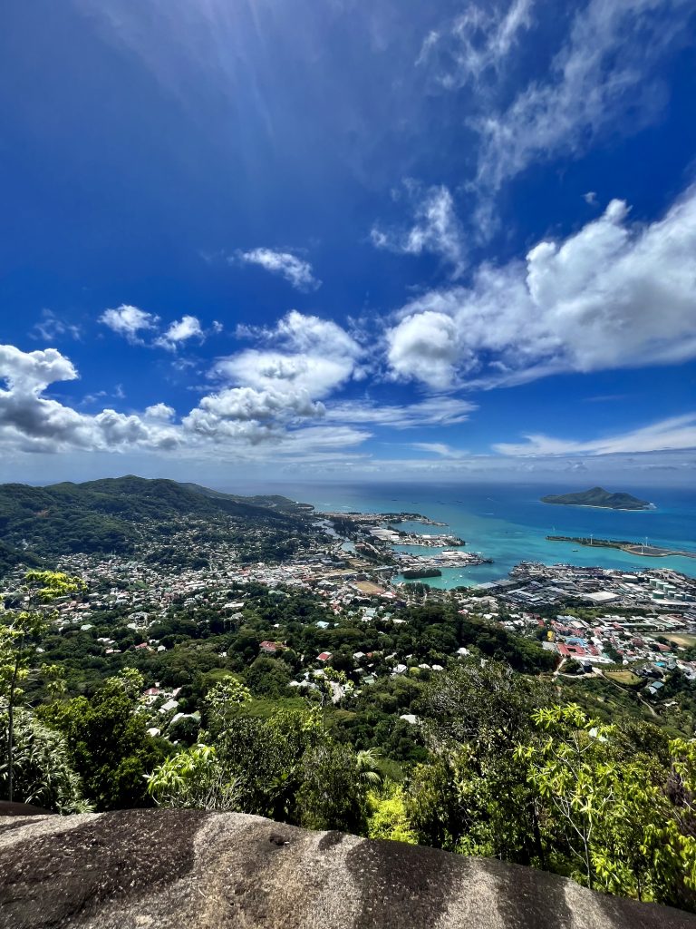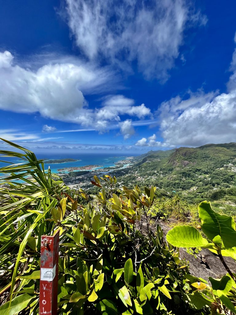 Er verspricht uns abermals einen spektakulären Ausblick über Mahé, bis hin zum Marinenationalpark. Ein kurzer Weg, mit knackigem Anstieg liegt vor uns. Aber schon der Startpunkt offeriert uns einen tollen Blick.