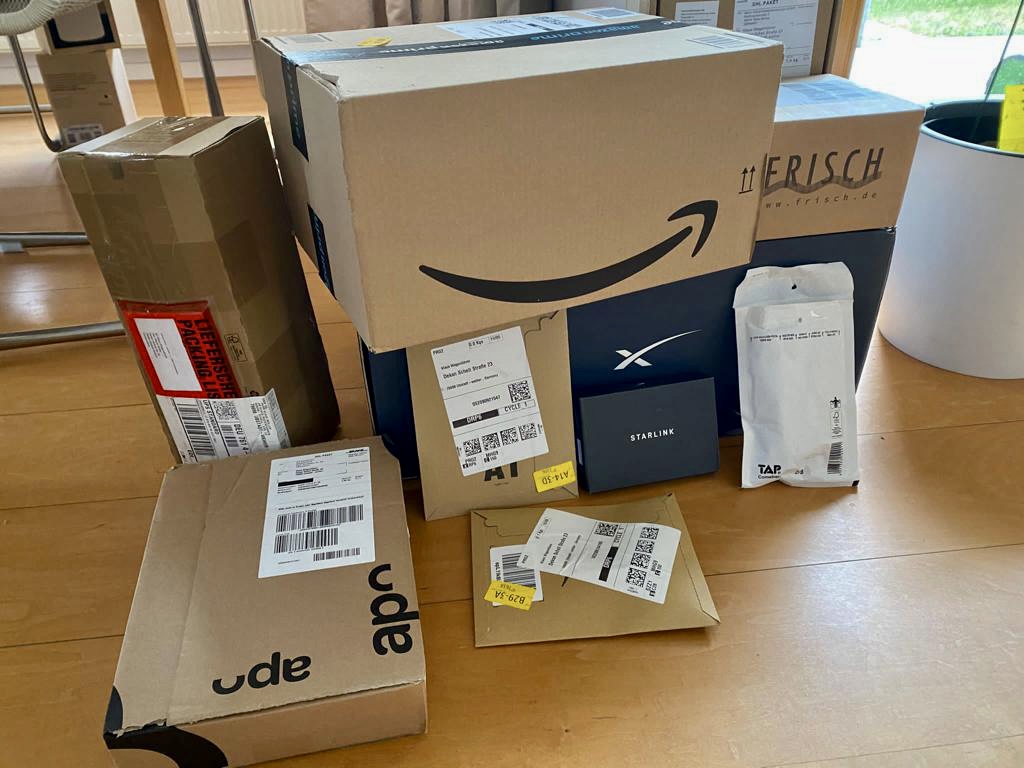 Die zwei kleinen 🧳 🧳 reichen da nun ganz und gar nicht mehr aus … Mittlerweile sind die Bestellungen auch schon bei Klaus W. angeliefert worden und er zeigt uns das “kleine” Häufchen Pakete.