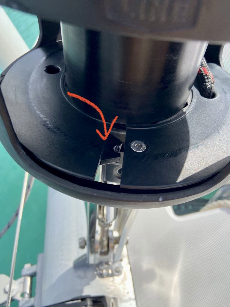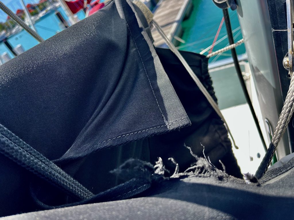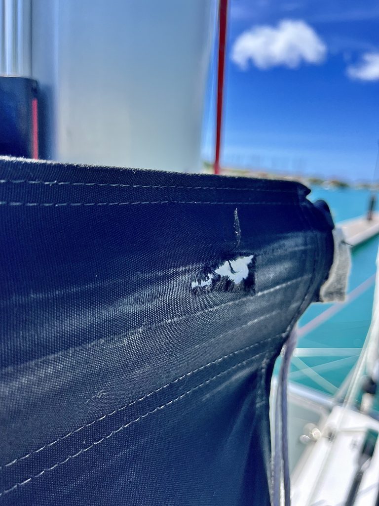 Jetzt ist auch klar, warum es immer schwerer wurde, das Vorsegel einzurollen. Die untere Scheibe ist ausgebrochen. Und warum? Wir hatten uns schon gewundert, warum nie auch nur eine Windung Leine auf dem Furler blieb, bei voll ausgerolltem Jib. (Später werden wir erfahren, dass der Rigger da wirklich einen Fehler gemacht hat.) Ich musste immer höllisch aufpassen, dass ich auch rechtzeitig stoppe. Hat wohl nicht immer geklappt, und die Kraft der Elektrowinch hat dann mit Zug an der Leine, die untere Drehscheibe abgerissen. Das kann so natürlich nicht bleiben! Aber wo und wie jetzt an ein passendes Ersatzteil kommen? Da muss Klaus erstmal recherchieren. Das ist aber nicht alles, was er so entdeckt… Als nächstes fällt ihm auf, dass das im Schutzstrumpf versteckte, breite Gummiband, welches den Haken der Bridle in der Ankerkette befestigt, nur noch am seidenen Faden hängt. Deshalb konnte ich immer besser die Bridle fest machen. 😝 Das breite Gummiband wurde immer lockerer… Auch das kann so nicht bleiben! Und dann haben wir ja noch die eingerissene Großsegeltasche, eine zweite aufgescheuerte Stelle ist auch noch dazu gekommen.