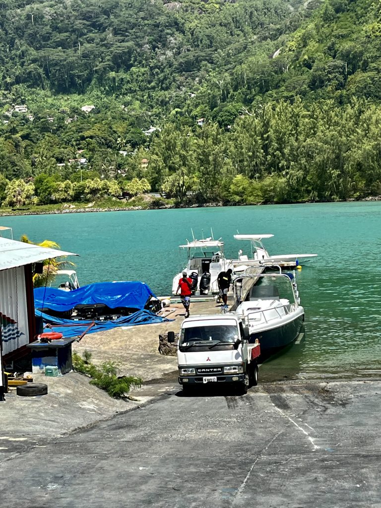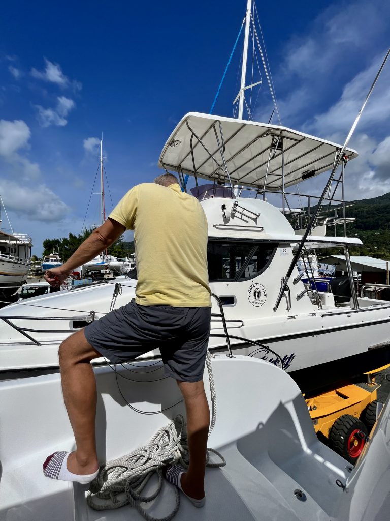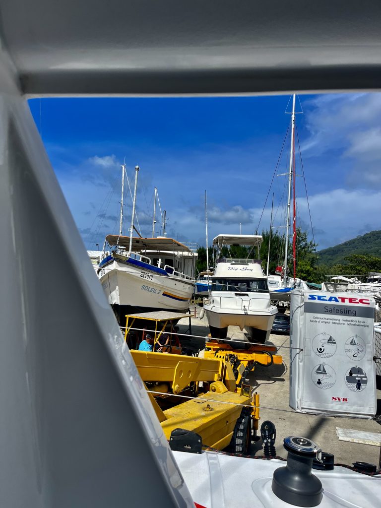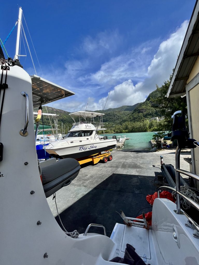 Zwischenzeitlich ist Keith, der Chef von der Eden Island Marina, mit einem seiner Leute hier aufgeschlagen und schaut sich, glaube ich, das verunglückte Motorboot an. Er kommt zurück, ich begrüße ihn, aber erst bei dem Bootsnamen Yuti, schnackelts. Wir kommen morgen zurück, meint Klaus. Nein, meint Keith, wir hätten keinen Liegeplatz mehr. Waaas??? Ja, er bekäme eine 110 Meter lange Superyacht rein, und wir wüssten ja um unsere Vereinbarung… Oh Schreck. 🫣 Können wir nicht vor Tipsy Tuna festmachen? Nein, die müssten auch weg und wieder auf ihren alten Liegeplatz zurück. Wir müssten halt draußen irgendwo ankern. So sei ja unsere Vereinbarung. Ohhh noooooo… 😨. Da fängt er an zu lachen, er hat uns volle Kannte hochgenommen. Menno…. 😖. Mir ist jetzt irgendwie schlecht. Da wird der Trailer unter uns weggezogen, ein weiteres Motorboot soll zu Wasser gelassen werden, und dafür müssen sie an uns vorbei. Millimeterarbeit, kann ich nur sagen. Ich springe, nein schleiche vorne auf dem Boot herum, so dass Yuti jetzt bloß nicht umkippt und passe auf, dass weder der Trailer, noch das Boot uns touchieren. Klaus guckt hinten…