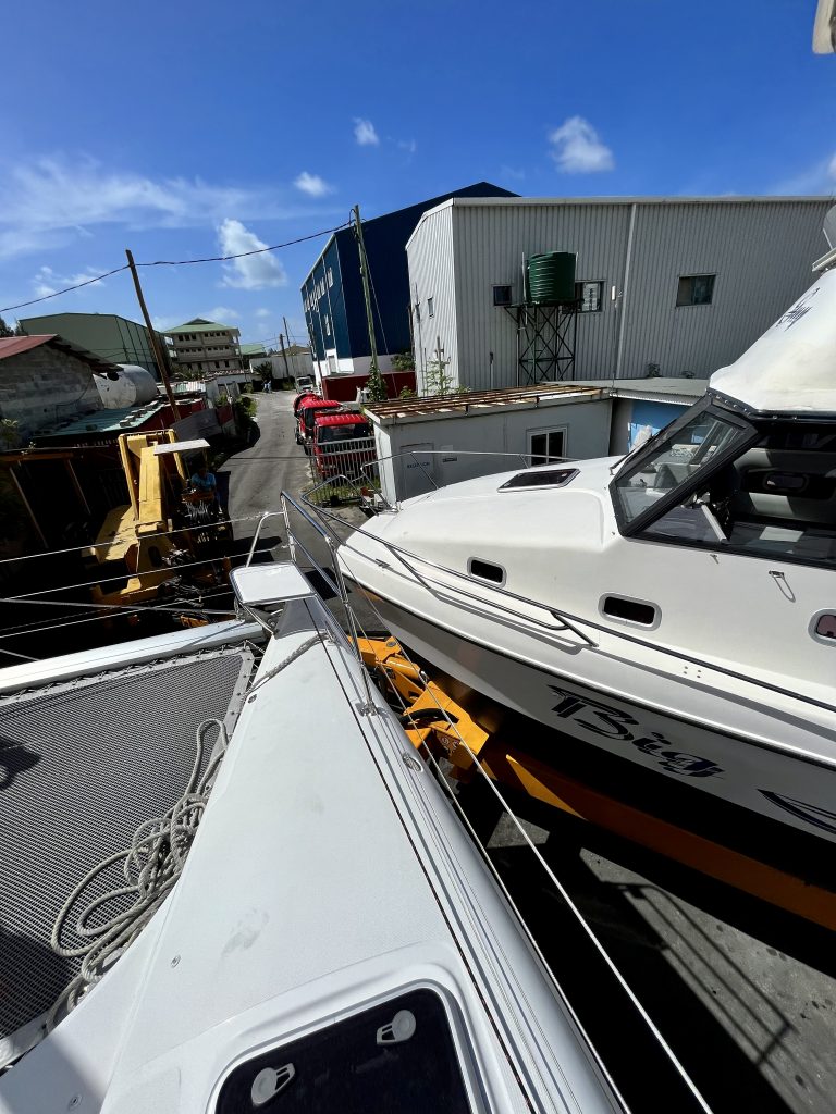 Das gerade fertig gestrichene und polierte Boot hat lange Kratzer an der Steuerbordseite. Mit viel Aufwand und einem herbeigeschafften kleinen Kran, wird es wieder an Land gezogen und irgendwo hingestellt, es ist verdammt eng und vollgestellt hier.