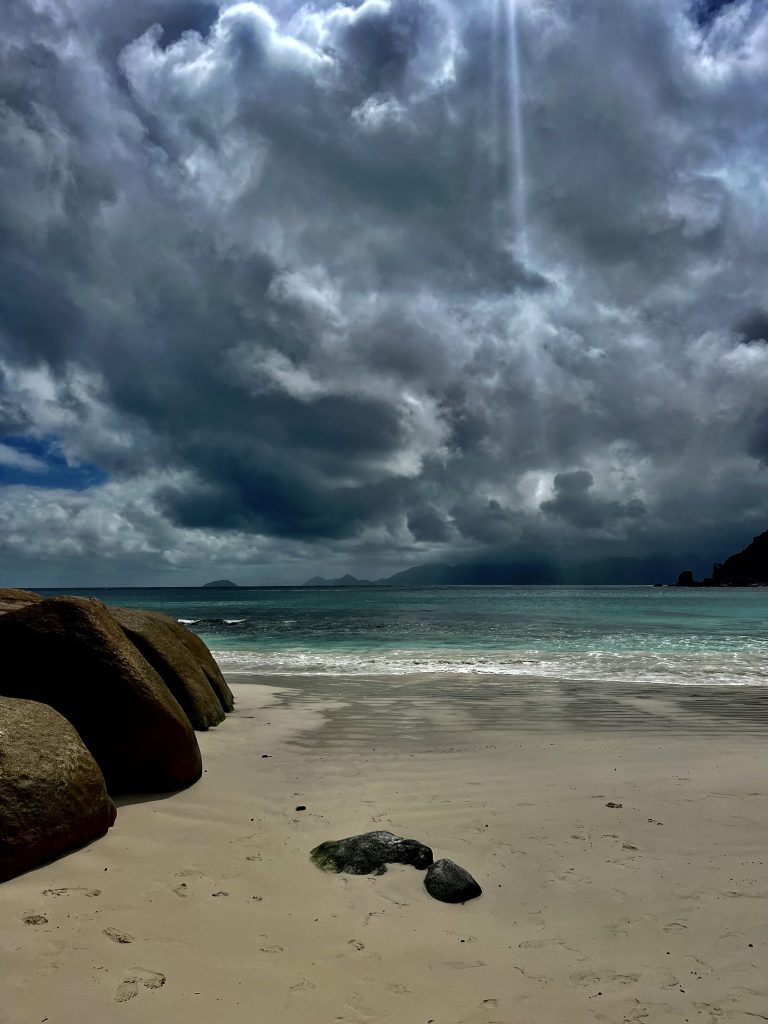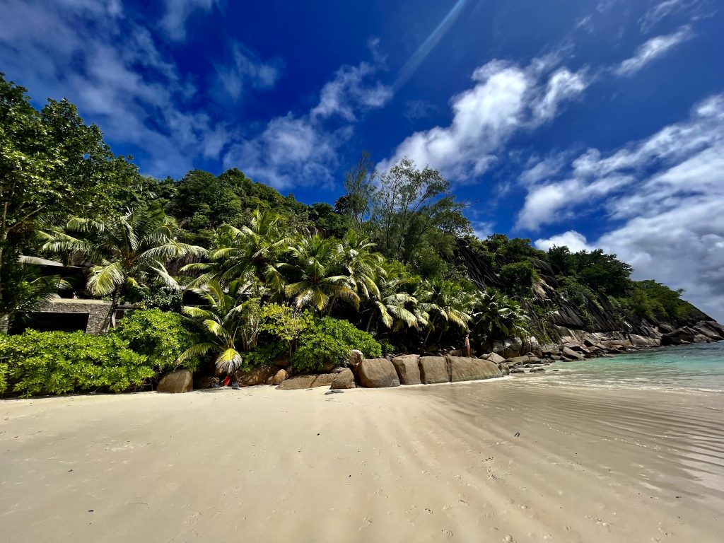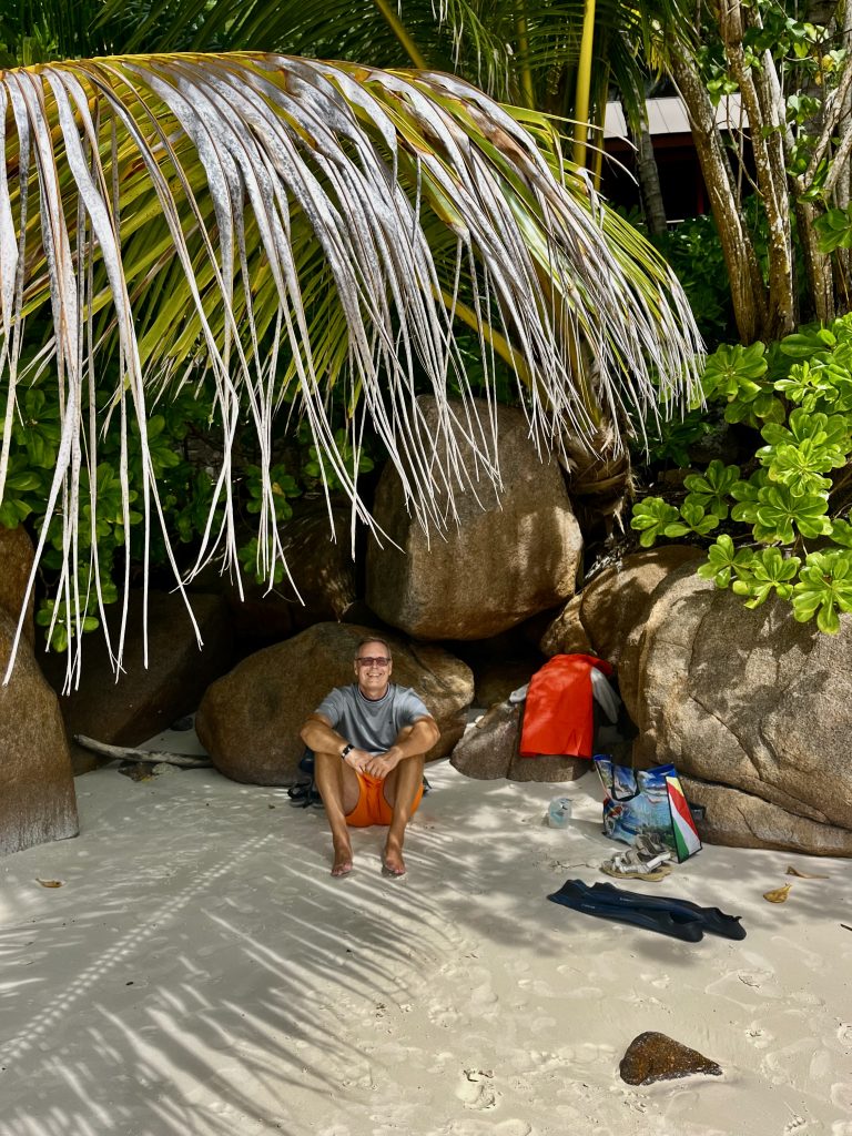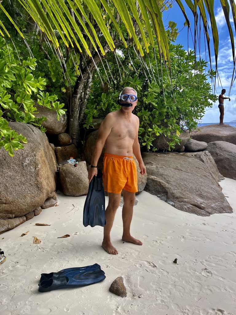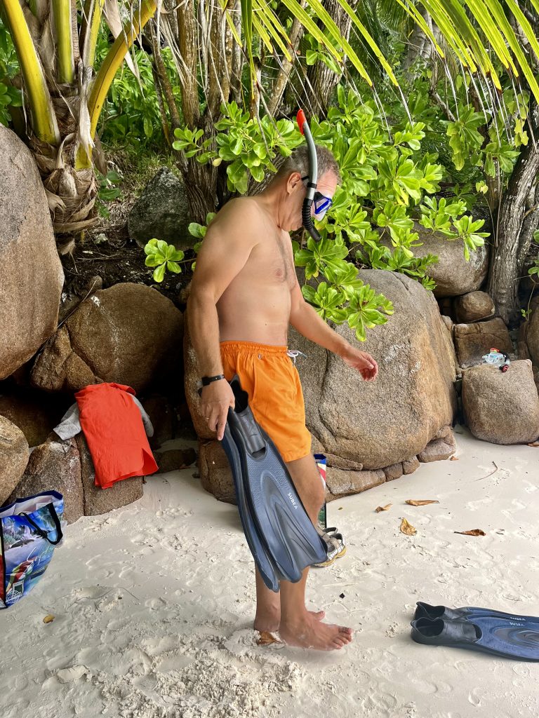 Im Wasser, an der Seite der Felswand gibt es ordentlich Steine und Korallen und damit auch Fische, die ich mir jetzt sofort anschauen möchte. Also rein in den Shorty, Brille auf, Schnorchel in den Mund und ab ins Wasser. Der Wellengang ist heftig, die Flut kommt, und ich mühe mich kräftig die Flossen anzubekommen. Dann geht’s aber ab und schnell sehe ich die ersten Brummer. Große Doktoren, Drücker und Papageienfische, auch kleine Schwärme von weiß-silbrigen Fischen, gaaanz kleine, blaue Fischchen und ein paar Seeigel sind zu entdecken. Da das Wasser recht flach ist, ist man sehr dicht an den Fischen dran und hat auch schonmal einen direkt vor der Brille. Toll! Die Sicht ist mittelmäßig, denn die Wellen wirbeln immer wieder Sand auf und trüben die selbige. Wenn die Sonne scheint, ist es aber ganz gut. Da schwimmt ein Flötenfisch direkt an mir vorbei, auch ein Pinzettenfisch düst ihm hinterher. Manchmal packt mich ne Welle und ich bin inmitten von unendlich vielen Luftbläschen, sehe nichts mehr und kann mich mal kurz nicht orientieren. Etwas gefährlich, aber ich werde zum Glück nirgends drauf gewirbelt. Dann zieht mich eine ablaufende Welle mit samt den Fische raus und die nächste auflaufende Welle wieder rein. Lustig! Das war jetzt wirklich nicht schlecht und für mich auf den Seychellen, der bisher beste Spot. Jetzt ist Klaus dran…