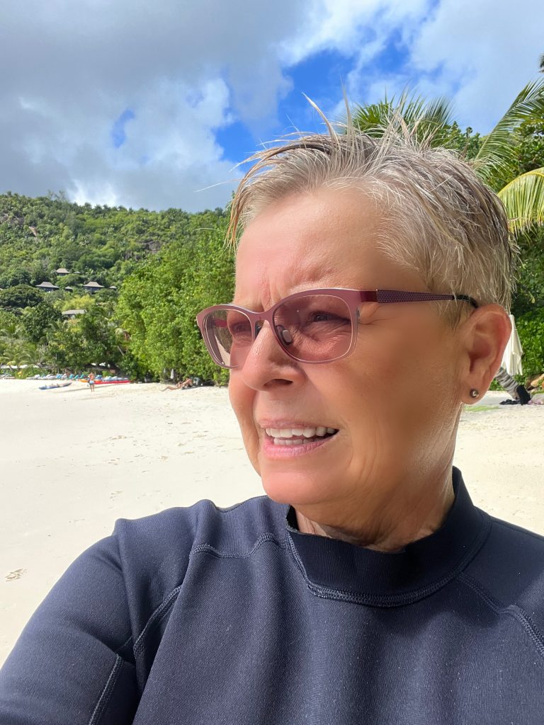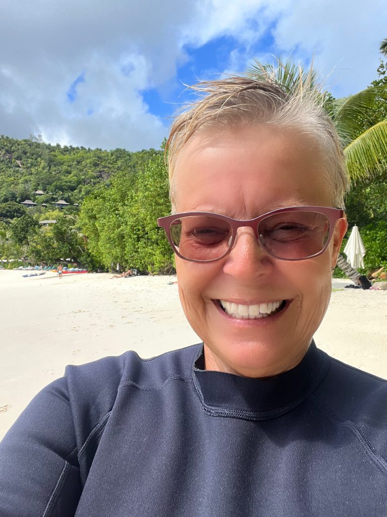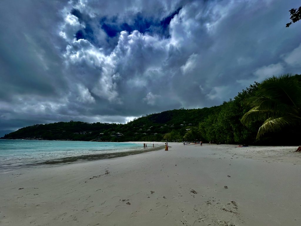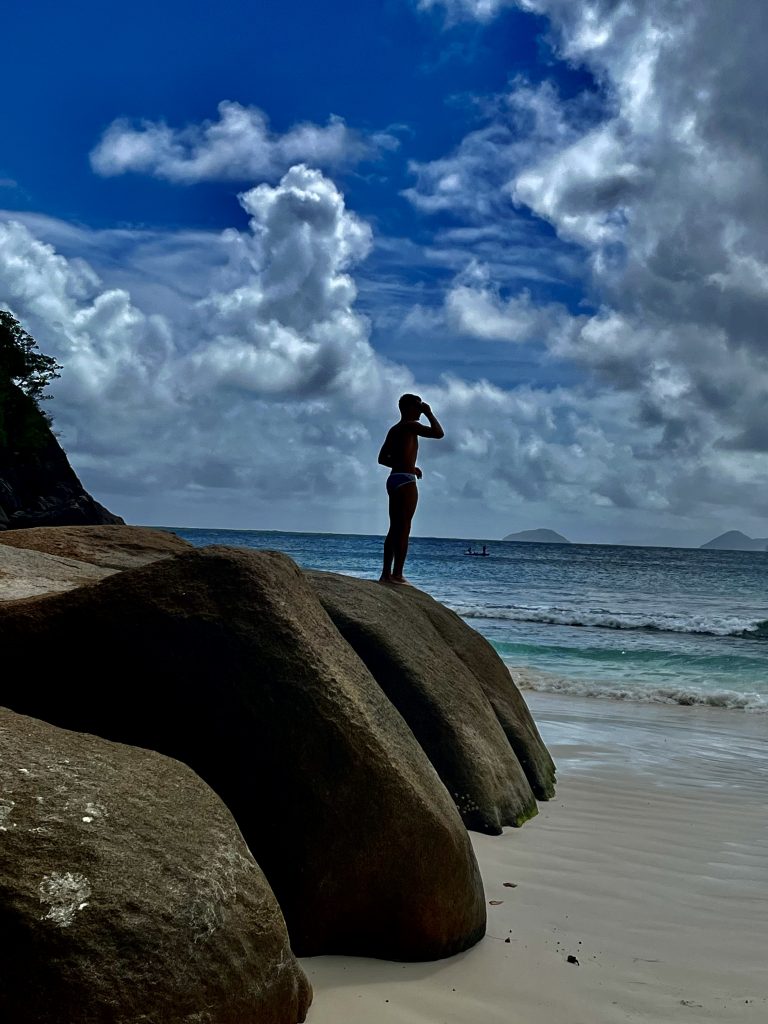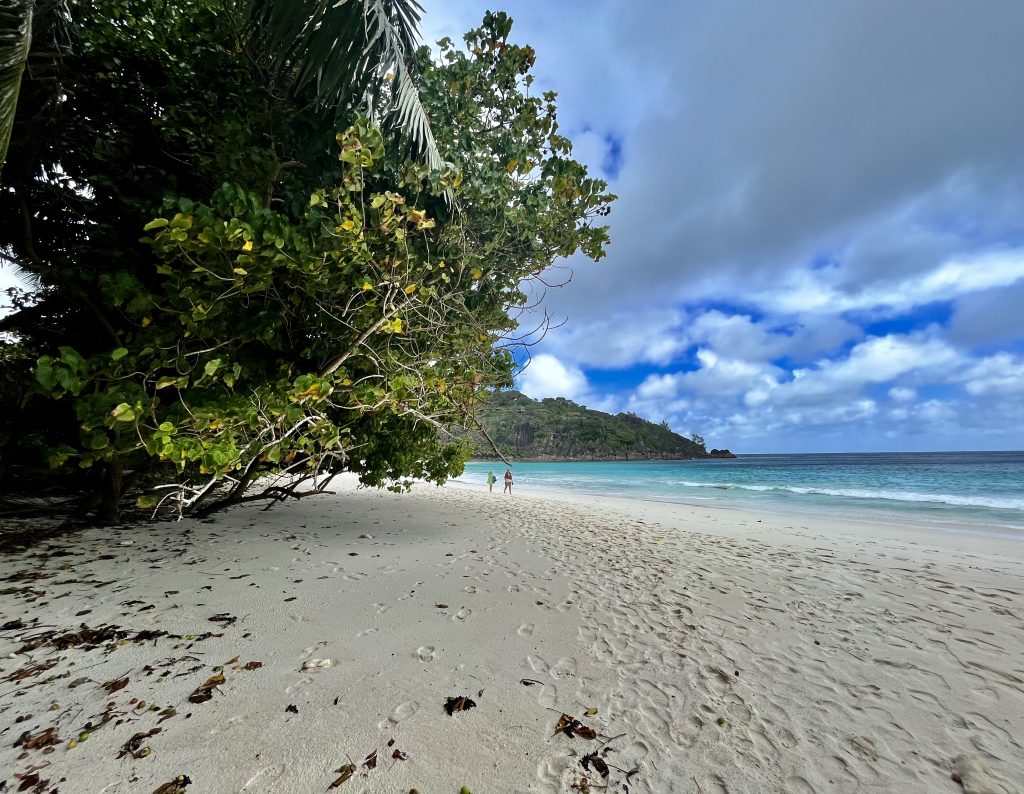 Im Wasser, an der Seite der Felswand gibt es ordentlich Steine und Korallen und damit auch Fische, die ich mir jetzt sofort anschauen möchte. Also rein in den Shorty, Brille auf, Schnorchel in den Mund und ab ins Wasser. Der Wellengang ist heftig, die Flut kommt, und ich mühe mich kräftig die Flossen anzubekommen. Dann geht’s aber ab und schnell sehe ich die ersten Brummer. Große Doktoren, Drücker und Papageienfische, auch kleine Schwärme von weiß-silbrigen Fischen, gaaanz kleine, blaue Fischchen und ein paar Seeigel sind zu entdecken. Da das Wasser recht flach ist, ist man sehr dicht an den Fischen dran und hat auch schonmal einen direkt vor der Brille. Toll! Die Sicht ist mittelmäßig, denn die Wellen wirbeln immer wieder Sand auf und trüben die selbige. Wenn die Sonne scheint, ist es aber ganz gut. Da schwimmt ein Flötenfisch direkt an mir vorbei, auch ein Pinzettenfisch düst ihm hinterher. Manchmal packt mich ne Welle und ich bin inmitten von unendlich vielen Luftbläschen, sehe nichts mehr und kann mich mal kurz nicht orientieren. Etwas gefährlich, aber ich werde zum Glück nirgends drauf gewirbelt. Dann zieht mich eine ablaufende Welle mit samt den Fische raus und die nächste auflaufende Welle wieder rein. Lustig! Das war jetzt wirklich nicht schlecht und für mich auf den Seychellen, der bisher beste Spot. Jetzt ist Klaus dran…