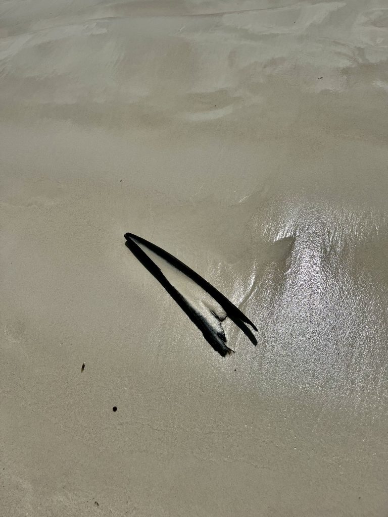 Bis zum linken Rand der Bucht stiefeln wir durch herrlichen Sand und lassen uns in einer hübschen Felsenecke nieder.