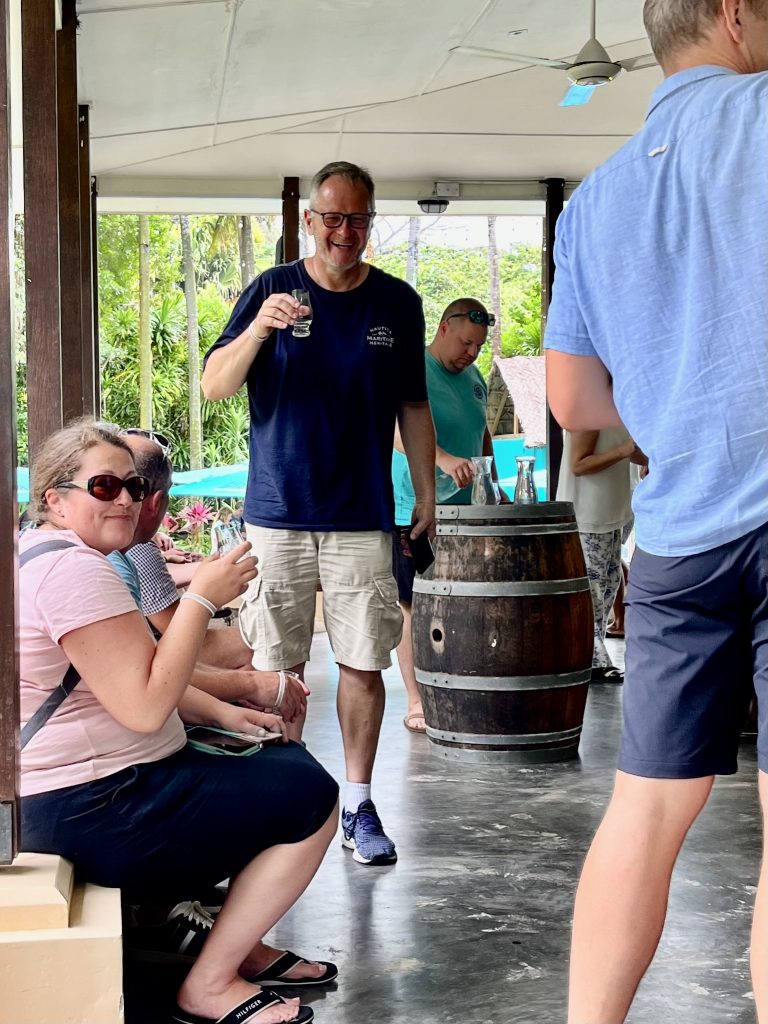 Klaus entscheidet sich fĂŒr die Sechs! Sechst Rum Sorten mit zum Beispiel Ananas oder Kokosnuss gemischt, wir fĂŒr die drei reinen Rum Sorten. Mensch, da brenntâs mir aber ganz schön die Kehle herunter, hĂŒstel, bei 43 % Alkohol. đ„” Also ein Alkoholfan werde ich in diesem Leben nicht mehr. Und die angebliche SĂŒĂe und Karamellnote, schmecke ich nicht wirklich. Schnell mit Wasser nachspĂŒlen !! Aber lustig ist es trotzdem!