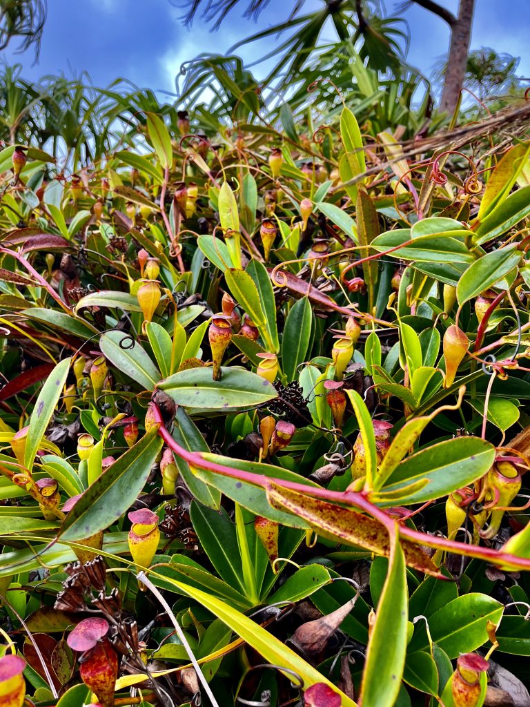 Aber auch am Boden ist’s interessant. Die hoch spezialisierte, fleischfressende Kannenpflanze, ist endemisch, wächst also nur hier. Und schließt nicht den Deckel, wenn sie was gefangen hat, wie ich bis eben dachte und auch schon schrieb… Nein, sie schließt den Deckel wenn es regnet, damit ihr am Kannenboden befindlicher Verdauungssaft nicht verwässert. Echt pfiffig!!