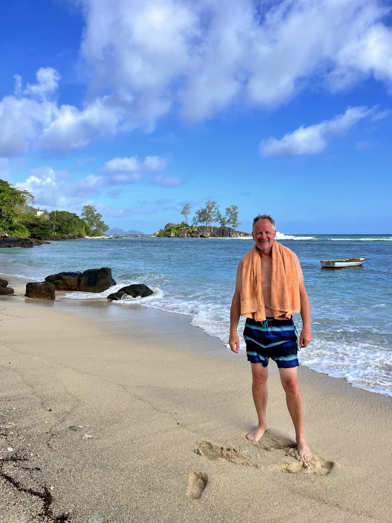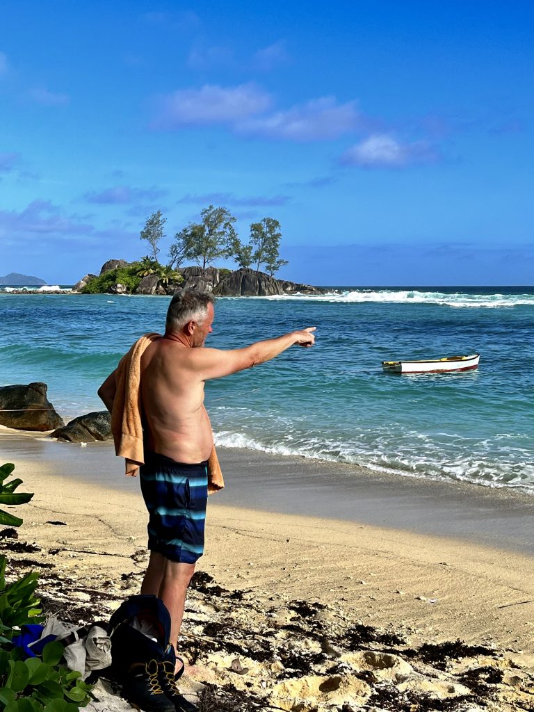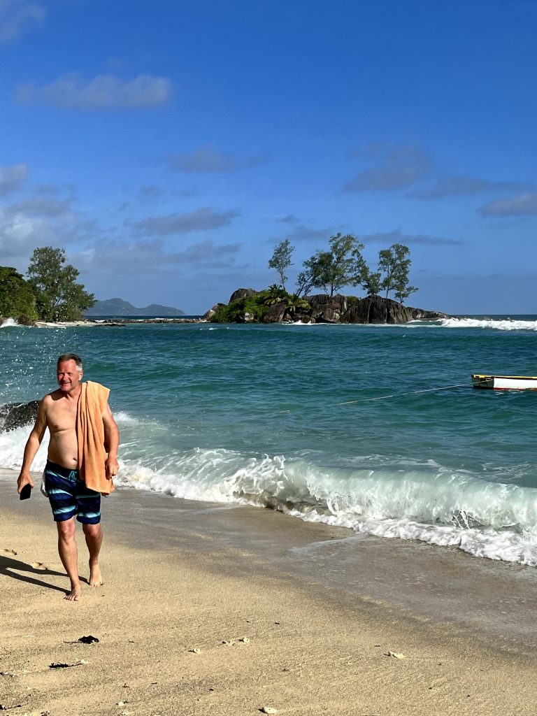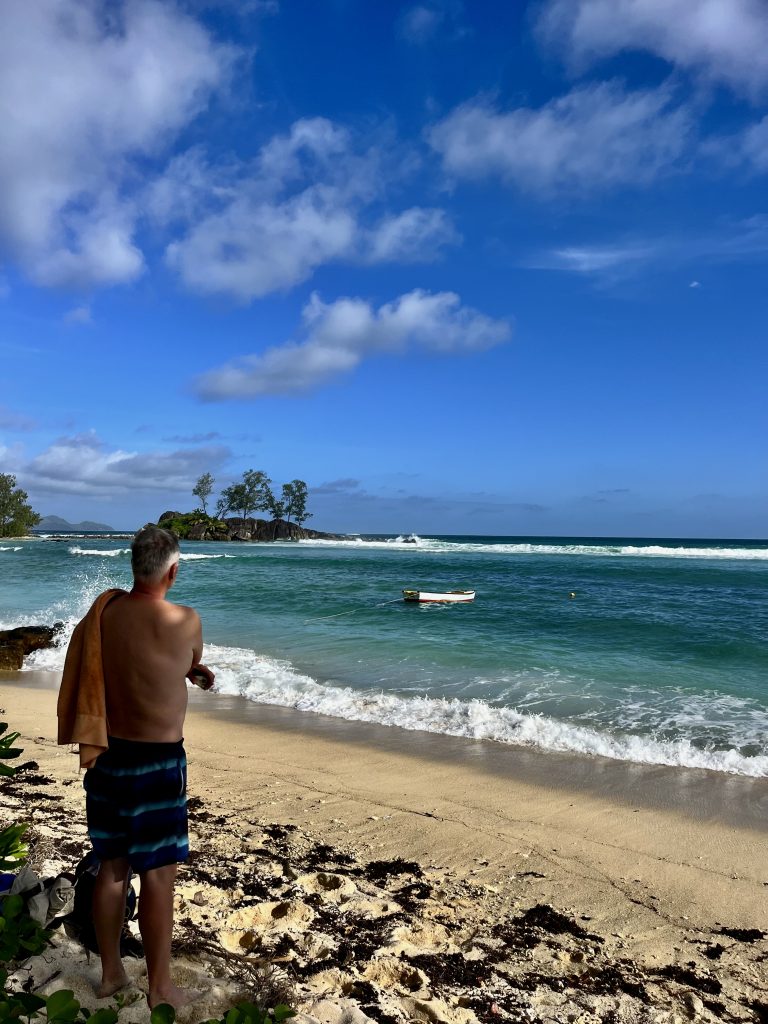 Wieder unten angekommen, halten wir an einem nahegelegenen Strand, direkt hinter der Straße. Davon gibt es hier viele, auf den Seychellen. Klaus W. möchte sich in die Wellen schmeißen.