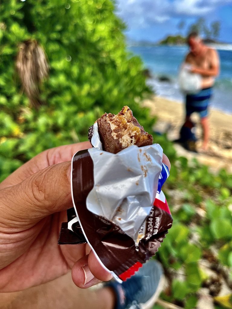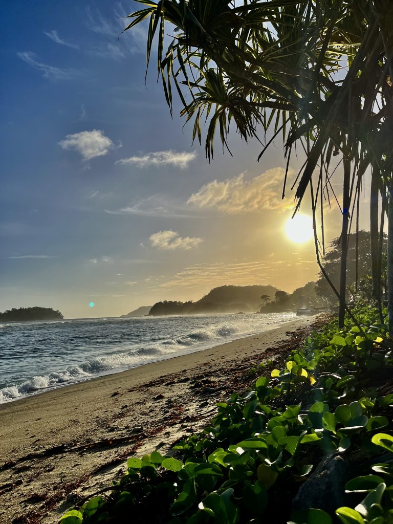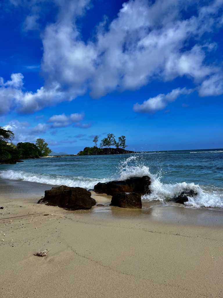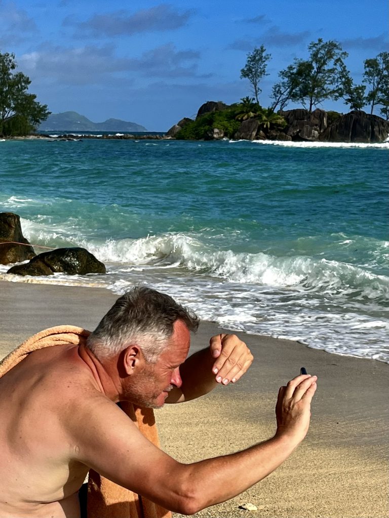 Wieder unten angekommen, halten wir an einem nahegelegenen Strand, direkt hinter der Straße. Davon gibt es hier viele, auf den Seychellen. Klaus W. möchte sich in die Wellen schmeißen.