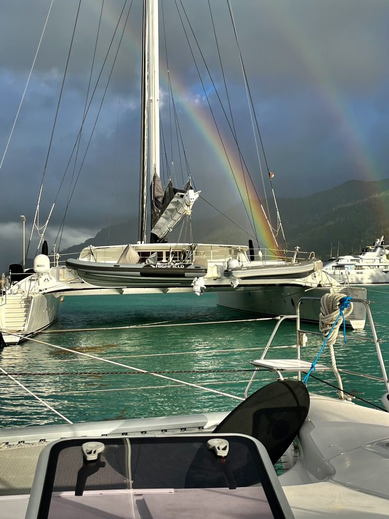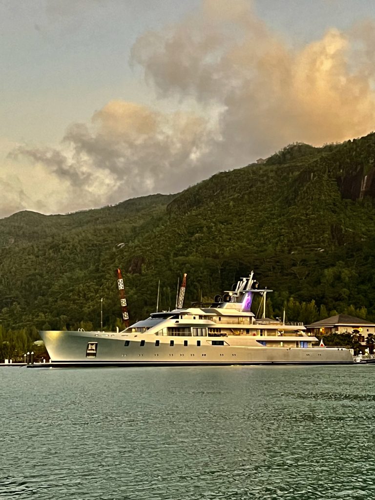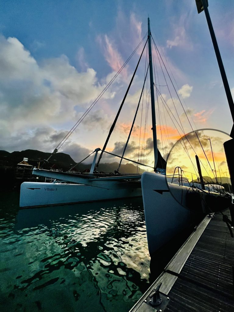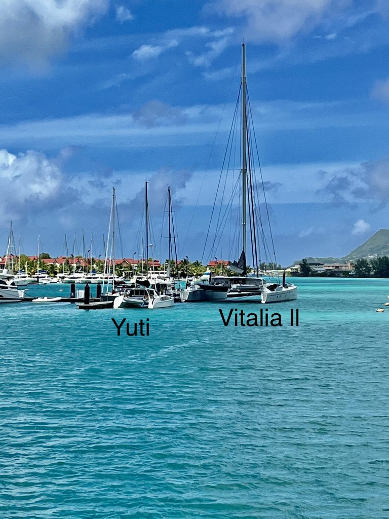 Dann lag sie jedoch von 2006 bis 2013 in der Werft ihrer Geburt. Bis der Sohn des französischen Baron Bich sich ihrer annahm, und sie zu einem immer noch sehr schnellen Fahrtensegler umbauen lies. Für sich und seine Familie sollte es nun um die Welt gehen. Neuer Name: Vitalia ll. Bis vor kurzem lag sie schräg gegenüber von uns, am Steg eines absoluten Nobelhotels. Doch dann kam ein Russe mit seiner, einem Kriegsschiff ähnelnden, Suuuperyacht