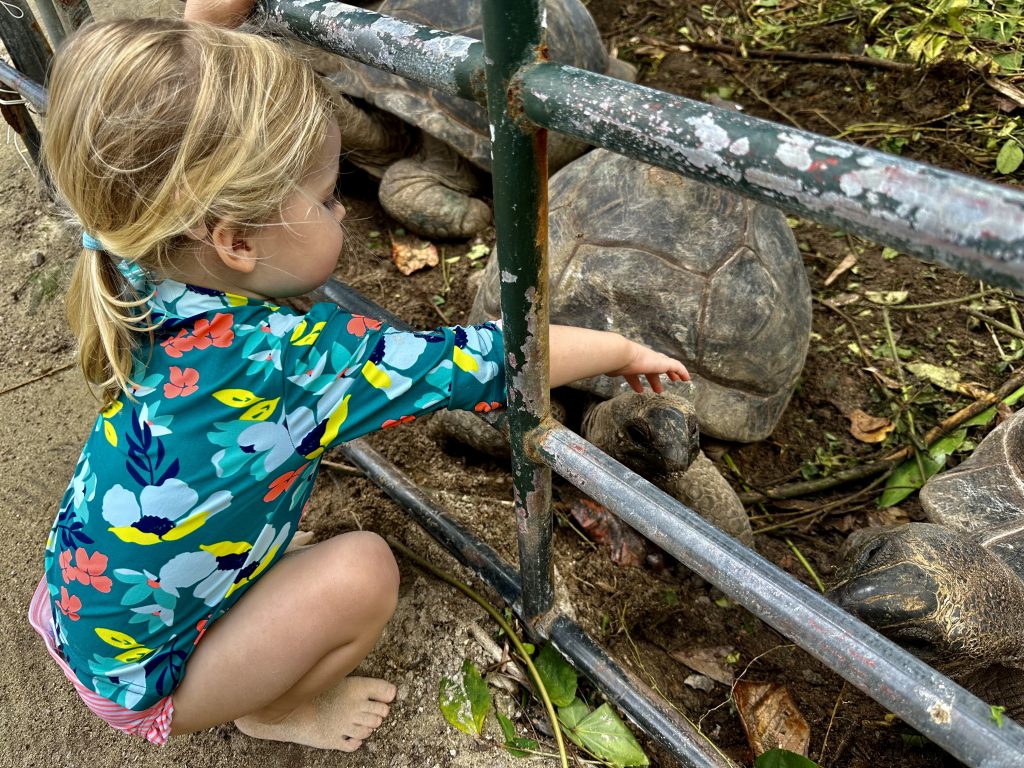 Auch hier gibt es wieder die obligatorischen Riesenschildkröten, und Alva liebt es sie zu füttern und zu streicheln. Die vergeblichen Sexversuche in einer hinteren Ecke des Geheges, bekommt sie zum Glück nicht mit. 😅