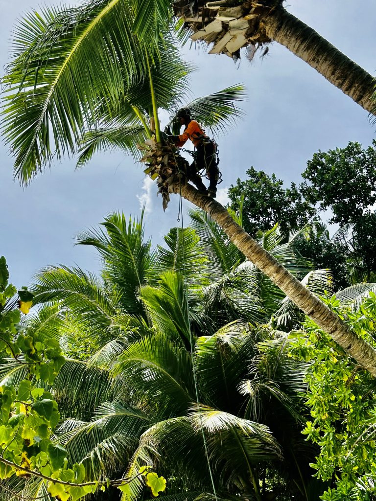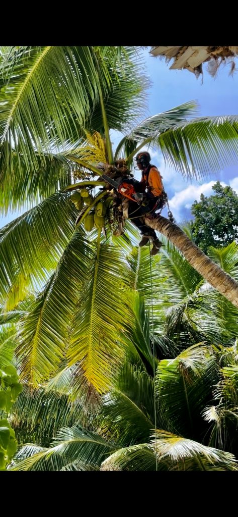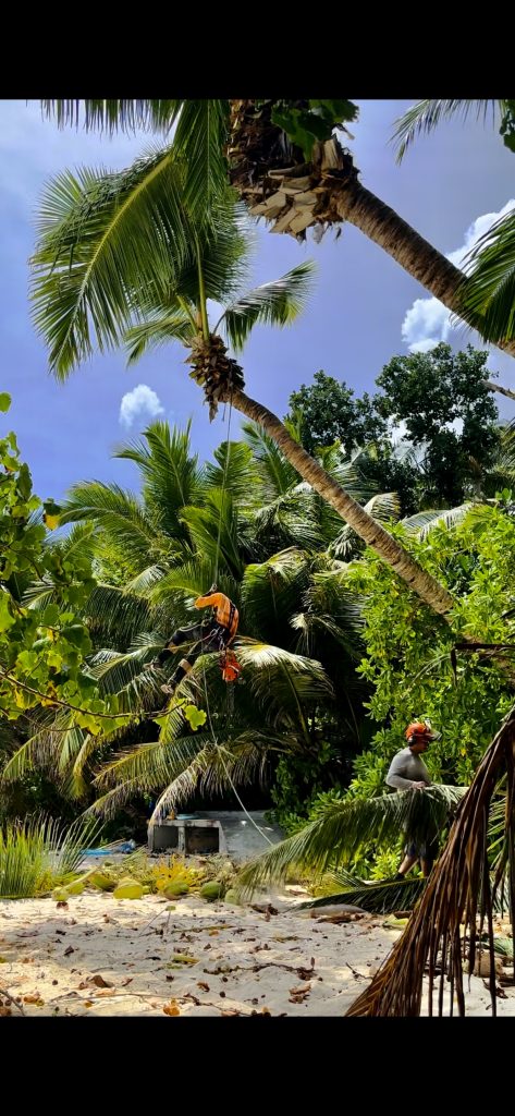 Four Seasons, es geht zum Schnorcheln. Wir melden uns an der Pforte und wandern durch die Anlage runter zum öffentlichen Strand. Dort angekommen, bauen wir gleich unter dem ersten schattenspendenden Baum unser Strandlager auf. Am anderen Ende des Strandes, wo wir uns sonst nahe der Felsen niederließen, ist alles unter Wasser. Es herrscht Flut. Gerade als wir alles ausgebreitet haben, kommen Gärtner und bitten uns zu weichen, da sie die nahegelegenen Palmen beschneiden müssen. Ohhh wie blöd… Aber wir gehorchen, und schon wird die Motorsäge angeschmissen und Kokosnüsse, riesige Palmenwedel und tausende großer Ameisen regnen vom Himmel und schlagen im Sand ein. Lärm und Unruhe im Paradies, aber spannend!