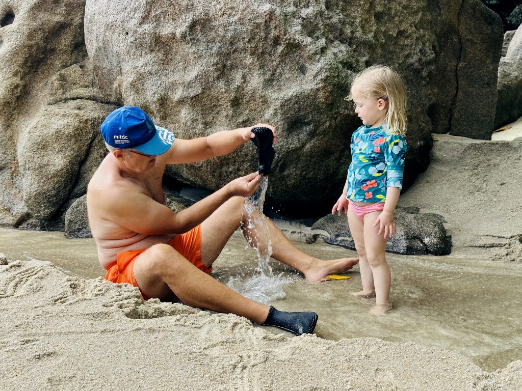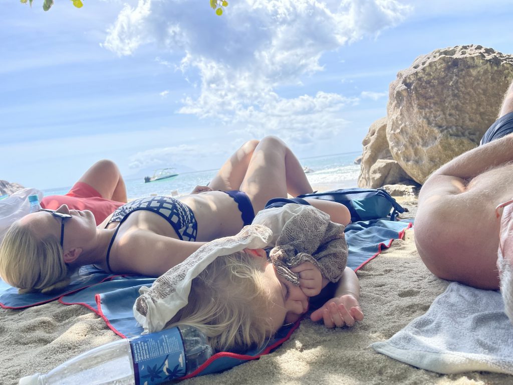 Das letzte Drittel wird sie dann getragen, denn die Steinstufen sind zu hoch und die Gefahr für sie zu groß. Norman macht das prima und es dauert nicht lange, da sind wir auch schon da❣️Die hübsche Bucht begrüßt uns wie gewohnt, mit feinem Sand, türkisem Wasser UND einem geöffneten Strandgrill. Juhu, es gibt was zu trinken und zu futtern. 👍