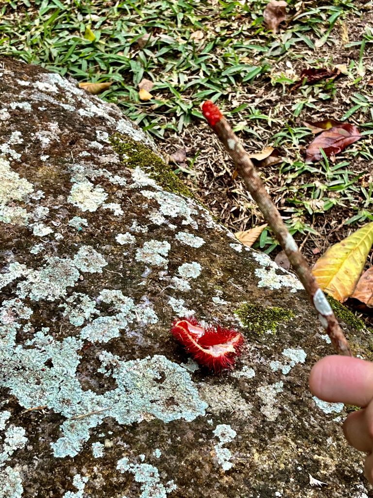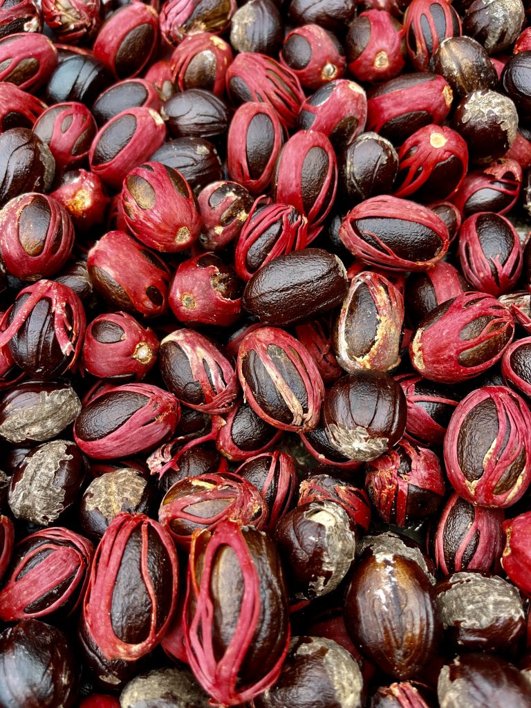 Der Lippenstiftbaum gibt ordentlich Farbe ab und viele Muskatnüsse wandern in unsere Taschen. 🤗
