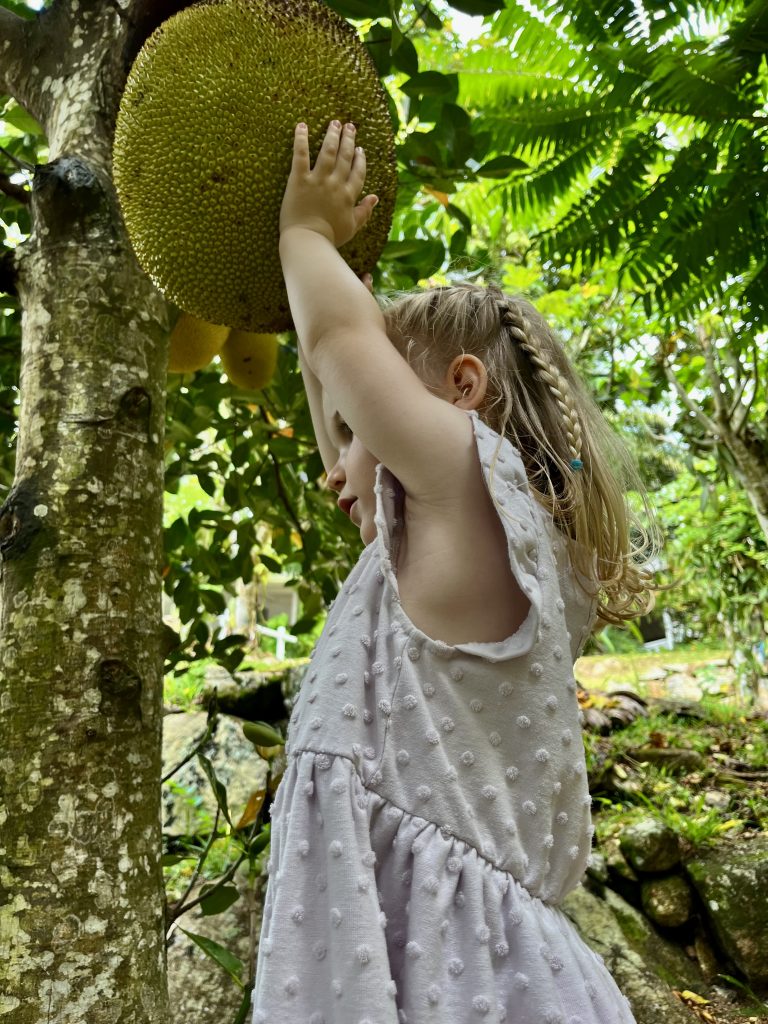 Auch die Glucke mit ihren Küken interessiert und die schweren Jackfruits hängen immer noch…