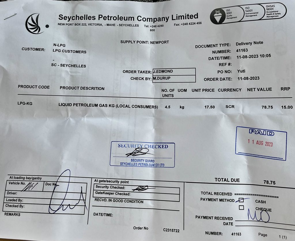 Am Vormittag war Familie Kißler bereits am Pool und wir bei der Tanke, um Benzin fürs Dinghy und Gas zum Kochen nachzufüllen. Dinghybenzin, gar kein Problem, aber unseren süßen, kleinen, 4,5 Liter Gasbehälter auffüllen zu lassen ist nicht ganz so leicht. Da ist zwar ein Käfig, mit lauter verschiedenen Gasbehältern und auch ein LKW, der gerade neue Flaschen bringt, aber wir können ja nicht tauschen, wir müssen auffüllen lassen. Zum Glück ist da auch ein sehr netter LKW-Fahrer, der schnell mal telefoniert und uns dann sagt, wo wir auffüllen lassen können und nach wem wir fragen sollen. SPC ist die Adresse und Tony unser Mann. Mit Auto alles kein Problem, gegenüber des Hypermarktes ist diese besagte Gasfüllstation. Wir düsen hin, parken aber fälschlicherweise ein Gebäude zu früh. Macht nichts, wir dürfen bleiben und laufen rüber zur Seychelles Petroleum Company Limited. Gar nicht so klein, der Laden. Dafür aber unser Gasfläschchen. 🤭 Wir unterbreiten unseren Wunsch am Empfang und fragen nach Tony. Der nette junge Mann, ist nicht Tony, aber hilft uns weiter. Gasbehälter bitte dort abstellen, nur einer? Ja, nur einer! Dann zum Bezahlen 200 Meter zum Silo laufen, da ist ein mehrstöckiges Gebäude, dort bitte zahlen. Machen wir. Die Empfangsdame fragt gleich zweimal nach der Menge unserer Behälter, zwei? Nein, nur einer, 4,5 Liter Propangas. Nur einer? Ja, nur einer. Ein Papier mit dreifachem Durchschlag wird ausgefüllt und mindestens dreimal gestempelt, unterschrieben und uns zum Bezahlen übergeben. Einen Schreibtisch hinter Glas weiter rechts, wird bezahlt, ganze 5,- Euro, unterschrieben, auch von uns und gestempelt. Mit dem Papier plus seinen drei Durchschlägen geht’s zurück, wieder zum Officer. Unsere Flasche ist gefüllt, der Officer bekommt den Zettelkram, unterschreibt, heftet das Original ab und schickt uns zum Ausgang, zu einem weiteren Officepoint.